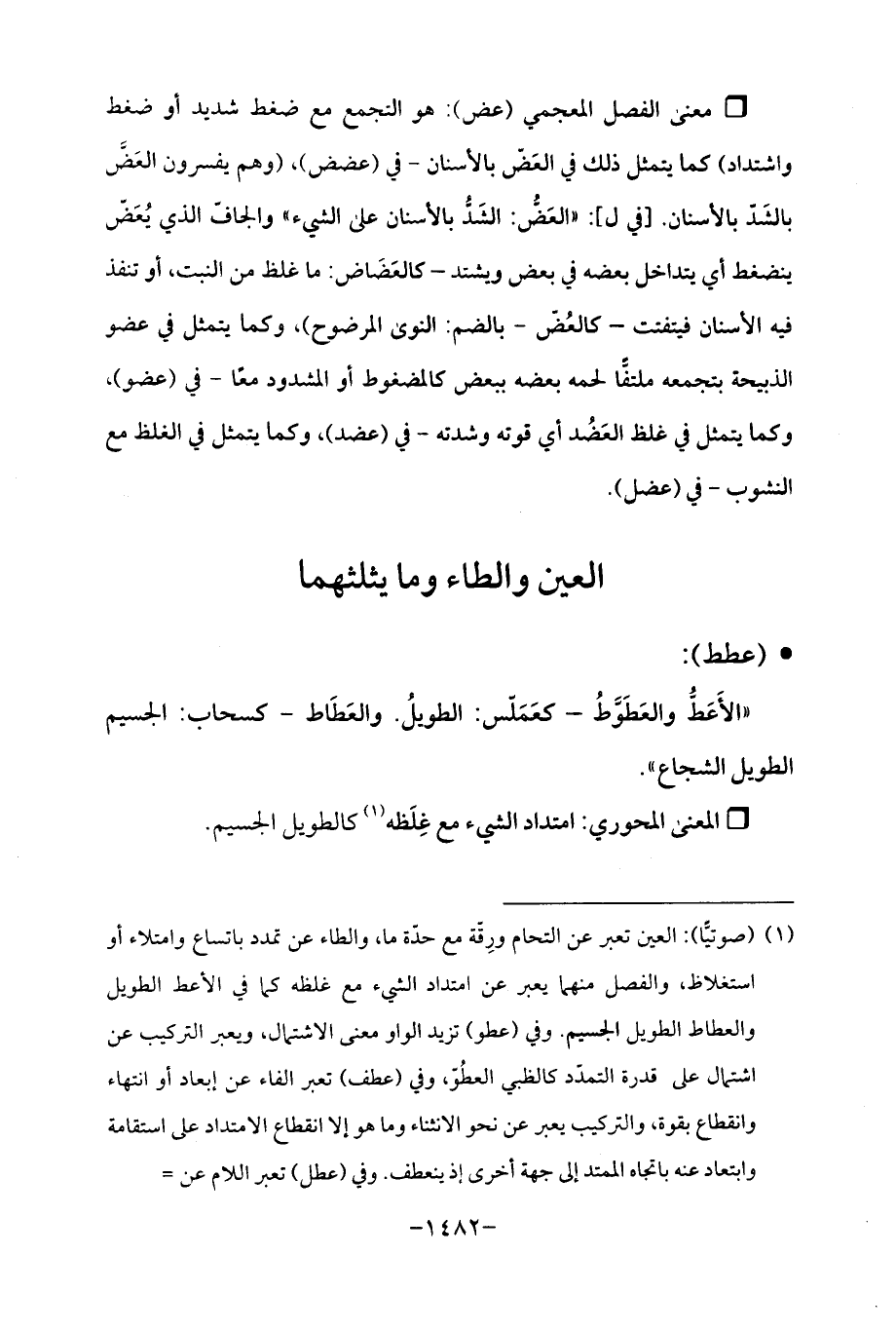 (¬1) (صوتيًّا): العين تعبر عن التحام ورِقّة مع حدّة ما، والطاء عن تمدد باتساع وامتلاء أو استغلاظ، والفصل منهما يعبر عن امتداد الشيء مع غلظه كما في الأعط الطويل والعطاط الطويل الجسيم. وفي (عطو) تزيد الواو معنى الاشتمال، ويعبر التركيب عن اشتمال على قدرة التمدّد كالظبي العطُوّ، وفي (عطف) تعبر الفاء عن إبعاد أو انتهاء وانقطاع بقوة، والتركيب يعبر عن نحو الانثناء وما هو إلا انقطاع الامتداد على استقامة وابتعاد عنه باتجاه الممتد إلى جهة أخرى إذ ينعطف. وفي (عطل) تعبر اللام عن =