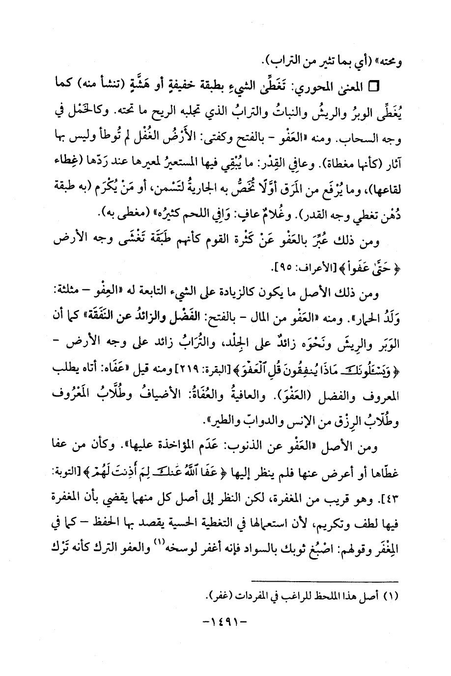 ومن الأرض "العَفو عن الذنوب: عَدَم المؤاخذة عليها ". وكأن من عفا غطّاها أو أعرض عنها فلم ينظر إليها {عَفَا اللَّهُ عَنْكَ لِمَ أَذِنْتَ لَهُمْ} [التوبة: 43]. وهو قريب من المغفرة، لكن النظر إلى أصل كل منهما يقضي بأن المغفرة فيها لطف وتكريم، لأن استعمالها في العطية الحسية يقصد بها الحفظ - كما في المِغْفَر وقولهم: اصْبُغ ثوبك بالسواد فإنه أغفر لوسخه (¬1) والعفو الترك كأنه تَرْك
