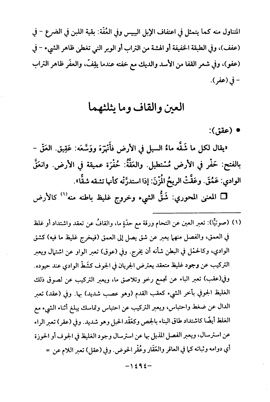 (¬1) (صوتيًّا): تعبر العين عن التحام ورقة مع حدّةٍ ما، والقافُ عن تعقد واشتداد أو غلظ في العمق، والفصل منهما يعبر عن شق يصل إلى العمق (فيخرج غليظ ما فيه) كشق الوادي، وكالحمْل في البطن شأنه أن يخرج. وفي (عوق) تعبر الواو عن اشتمال ويعبر التركيب عن وجود غليظ متعقد يعترض الجريان في الجوف كشَطّ الوادي عند حيوده. وفي (عقب) تعبر الباء عن تجمع رخو وتلاصق ما، ويعبر التركيب عن لصوق ذلك الغليظ الجوفي بآخر الشيء كعقب القدم (وهو عصب شديد) بها. وفي (عقد) تعبر الدال عن ضغط واحتباس، ويعبر التركيب عن احتباس وتماصك يبلغ أثناء الشيء مع الغلظ أيضًا كاشتداد طاق البناء بالجص وكعَقْد المحل وهو شديد. وفي (عقر) تعبر الراء عن استرسال، وبعبر الفصل المذيل بها عن استرسال وجود الغليظ في الجوف أو الحوزة أي دوامه وثباته كما في العاقر والعَقَار وعُقْر الحوض. وفي (عقل) تعبر اللام عن =