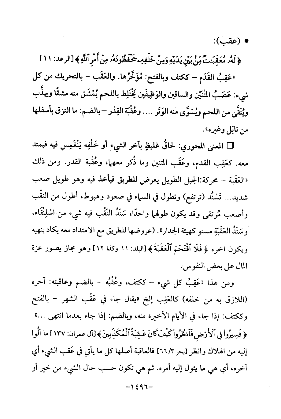 Qلحاقُ غليظٍ بآخر الشيء أو خَلْفِه يَنْغَمِس فيه فيمتد معه. كعَقِب القدم، وعَقَب المتنين وما ذُكر معهما، وعُقْبة القدر. ومن ذلك "العَقَبة -محركة: الجبل الطويل يعرض للطريق فيأخذ فيه وهو طويل صعب شديد. . . تَسْنُد (ترتفع) وتطول في السماء في صعود وهبوط، أطول من النقْب وأصعب مُرتقى وقد يكون طولها واحدًا، سَنَدُ النَقْب فيه شيء من اسْلِنْقَاء، وسَنَدُ العَقَبَةِ مستو كهيئة الجدار ". (عروضها للطريق مع الامتداد معه يكاد ينهيه ويكون آخره {فَلَا اقْتَحَمَ الْعَقَبَةَ} [البلد: 11 وكذا 12] وهو مجاز يصور عزة المال على بعض النفوس.