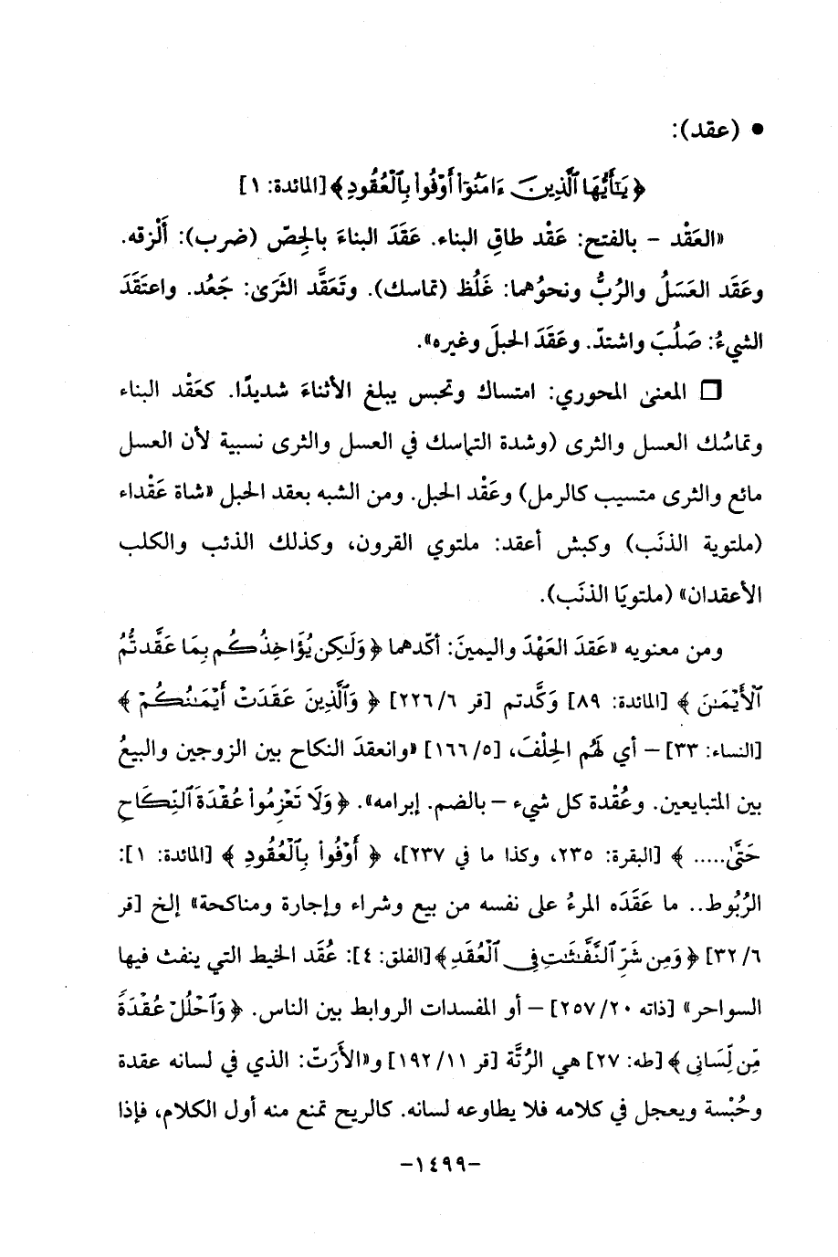 ومن معنويه "عَقدَ العَهْدَ واليمينَ: أكّدهما {وَلَكِنْ يُؤَاخِذُكُمْ بِمَا عَقَّدْتُمُ الْأَيْمَانَ} [المائدة: 89] وَكَّدتم [قر 6/ 226] {وَالَّذِينَ عَقَدَتْ أَيْمَانُكُمْ} [النساء: 33]- أي لَهُم الحِلْفَ، [5/ 166] "وانعقدَ النكاح بين الزوجين والبيعُ بين المتبايعين. وعُقدة كل شيء -بالضم. إبرامه ". {وَلَا تَعْزِمُوا عُقْدَةَ النِّكَاحِ حَتَّى. . .} [البقرة: 235، وكذا ما في 237]، {أَوْفُوا بِالْعُقُودِ} [المائدة: 1]: الرُبُوط. . ما عَقَدَه المرءُ على نفسه من بيع وشراء وإجارة ومناكحة "إلخ [قر 6/ 32] {وَمِنْ شَرِّ النَّفَّاثَاتِ فِي الْعُقَدِ} [الفلق: 4]: عُقَد الخيط التي ينفث فيها السواحر " [ذاته 20/ 257]- أو المفسدات الروابط بين الناس. {وَاحْلُلْ عُقْدَةً مِنْ لِسَانِي} [طه: 27] هي الرُتَّة [قر 11/ 192] و "الأَرَتّ: الذي في لسانه عقدة وحُبْسة ويعجل في كلامه فلا يطاوعه لسانه. كالريح تمنع منه أول الكلام، فإذا