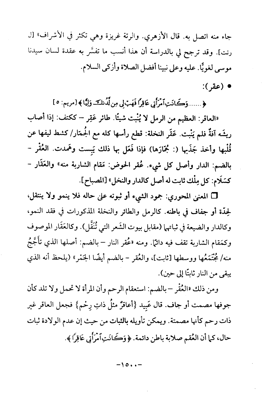 ومن ذلك "العُقْر -بالضم: استعقام الرحم وأن المرأة لا تحمل ولا تلد كأن جوفها مصمت أو جاف. قال عَبِيد {أعاقرٌ مثلُ ذاتِ رِحْم} فجعل العاقر غير ذات رحم كأنها مصمتة. ويمكن تأويله بالثبات من حيث إن عدم الولادة ثبات حال، كما أن العُقم صلابة باطن دائمة. {وَكَانَتِ امْرَأَتِي عَاقِرًا}.
