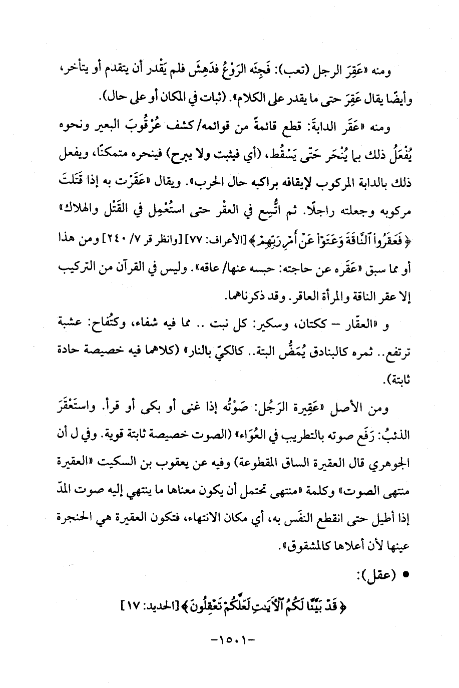 ومنه "عَقَر الدابةَ: قطع قائمةً من قوائمه/ كشف عُرْقُوبَ البعير ونحوه يُفْعَلُ ذلك بما يُنْحَر حَتّى يَسْقُط، (أي فيثبت ولا يبرح) فينحره متمكنًا، ويفعل ذلك بالدابة المركوب لإيقافه براكبه حال الحرب ". ويقال "عَقَرْت به إذا قَتَلتَ مركوبه وجعلته راجلًا. ثم اتُّسِع في العقْر حتى استُعْمِل في القَتْل والهلاك " {فَعَقَرُوا النَّاقَةَ وَعَتَوْا عَنْ أَمْرِ رَبِّهِمْ} [الأعراف: 77] [وانظر قر 7/ 240] ومن هذا أو مما سبق "عَقَره عن حاجته: حبسه عنها/ عاقه ". وليس في القرآن من التركيب إلا عقر الناقة والمرأة العاقر. وقد ذكرناهما.