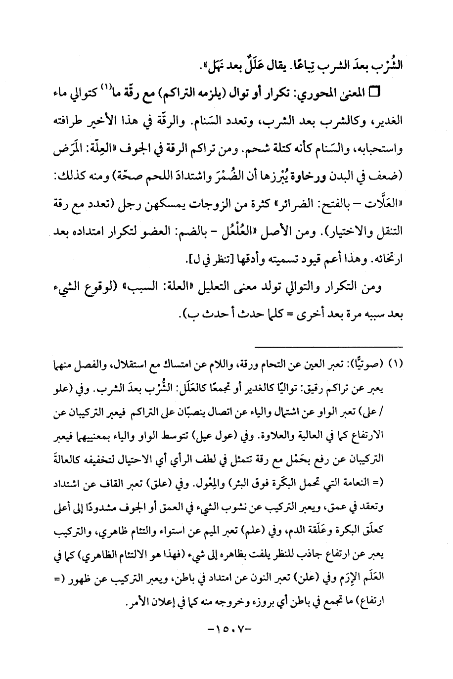 Qتكرار أو توال (يلزمه التراكم) مع رقّة ما (¬1) كتوالي ماء الغدير، وكالشرب بعد الشرب، وتعدد السَنام. والرقّة في هذا الأخير طرافته واستحبابه، والسَّنام كأنه كتلة شحم. ومن تراكم الرقة في الجوف "العِلَّة: المَرَض (ضعف في البدن ورخاوة يُبْرزها أن الضُمْرَ واشتدادَ اللحم صحّة) ومنه كذلك: "العَلَّات -بالفتح: الضرائر "كثرة من الزوجات يمسكهن رجل (تعدد مع رقة التنقل والاختيار). ومن الأصل: "العُلْعُل -بالضم: العضو لتكرار امتداده بعد ارتخائه. وهذا أعم قيود تسميته وأدقها [تنظر في ل].