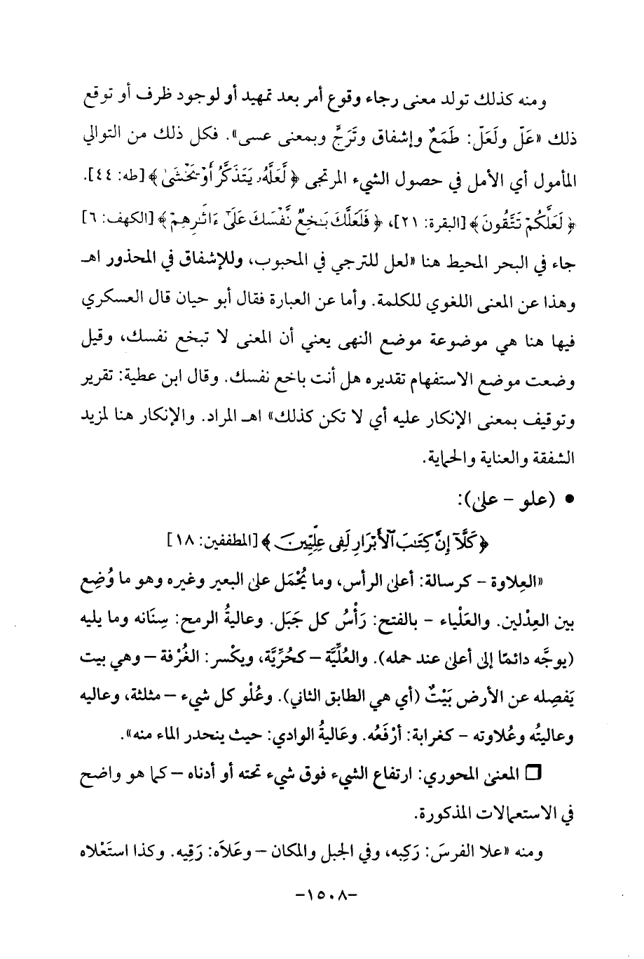 ومنه كذلك تولد معنى رجاء وقوع أمر بعد تمهيد أو لوجود ظرف أو توقع ذلك "عَلّ ولَعَلّ: طَمَعٌ وإشفاق وتَرَجٍّ وبمعنى عسى ". فكل ذلك من التوالي المأمول أي الأمل في حصول الشيء المرتجى {لَعَلَّهُ يَتَذَكَّرُ أَوْ يَخْشَى} [طه: 44]. {لَعَلَّكُمْ تَتَّقُونَ} [البقرة: 21]، {فَلَعَلَّكَ بَاخِعٌ نَفْسَكَ عَلَى آثَارِهِمْ} [الكهف: 6] جاء في البحر المحيط هنا "لعل للترجي في المحبوب، وللإشفاق في المحذور اهـ وهذا عن المعنى اللغوي للكلمة. وأما عن العبارة فقال أبو حيان قال العسكري فيها هنا هي موضوعة موضع النهى يعني أن المعنى لا تبخع نفسك، وقيل وضعت موضع الاستفهام تقديره هل أنت باخع نفسك. وقال ابن عطية: تقرير وتوقيف بمعنى الإنكار عليه أي لا تكن كذلك "اهـ المراد. والإنكار هنا لمزيد الثفقة والعناية والحماية.