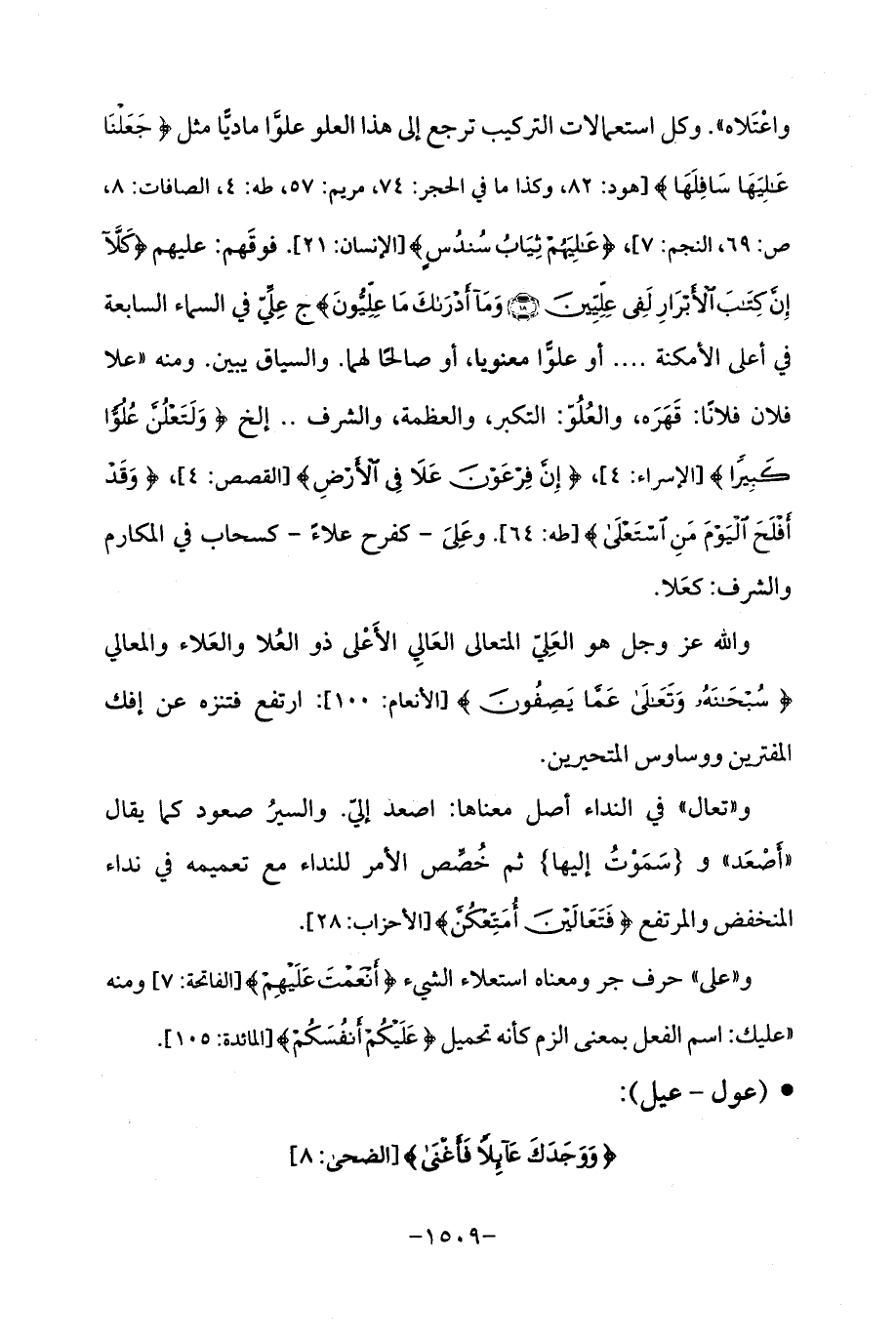 واعْتَلاه ". وكل استعمالات التركيب ترجع إلى هذا العلو علوًّا ماديًّا مثل {جَعَلْنَا عَالِيَهَا سَافِلَهَا} [هود: 82، وكذا ما في الحجر: 74، مريم 57، طه: 4، الصافات: 8، ص: 69، النجم: 7]، {عَالِيَهُمْ ثِيَابُ سُنْدُسٍ} [الإنسان: 21]. فوقَهم: عليهم {كَلَّا إِنَّ كِتَابَ الْأَبْرَارِ لَفِي عِلِّيِّينَ (18) وَمَا أَدْرَاكَ مَا عِلِّيُّونَ} ج عِلِّيّ في السماء السابعة في أعلى الأمكنة. . . أو علوًّا معنويًّا، أو صالحًا لهما. والسياق يبين. ومنه "علا فلان فلانًا: قَهَرَه، والعُلُوُّ: التكبر، والعظمة، والشرف. . إلخ {وَلَتَعْلُنَّ عُلُوًّا كَبِيرًا} [الإسراء: 4]، {إِنَّ فِرْعَوْنَ عَلَا فِي الْأَرْضِ} [القصص: 4]، {وَقَدْ أَفْلَحَ الْيَوْمَ مَنِ اسْتَعْلَى} [طه: 64]. وعَلِىَ -كفرح علاءً- كسحاب في المكارم والشرف: كعَلا.