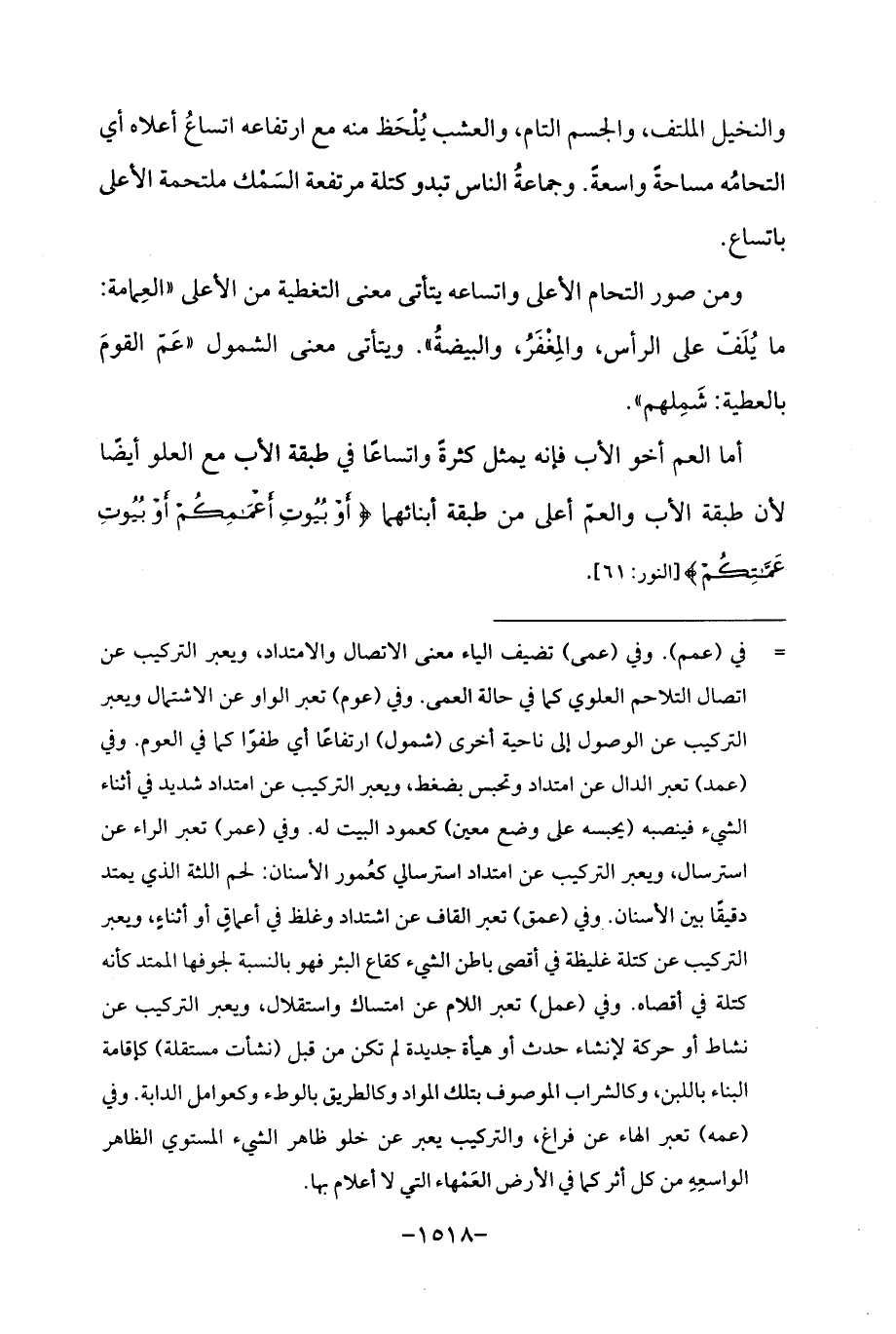 والنخيل الملتف، والجسم التام، والعشب يُلْحَظ منه مع ارتفاعه اتساعُ أعلاه أي التحامُه مساحةٌ واسعةٌ. وجماعةُ الناس تبدو كتلة مرتفعة السَمْك ملتحمة الأعلى باتساع.