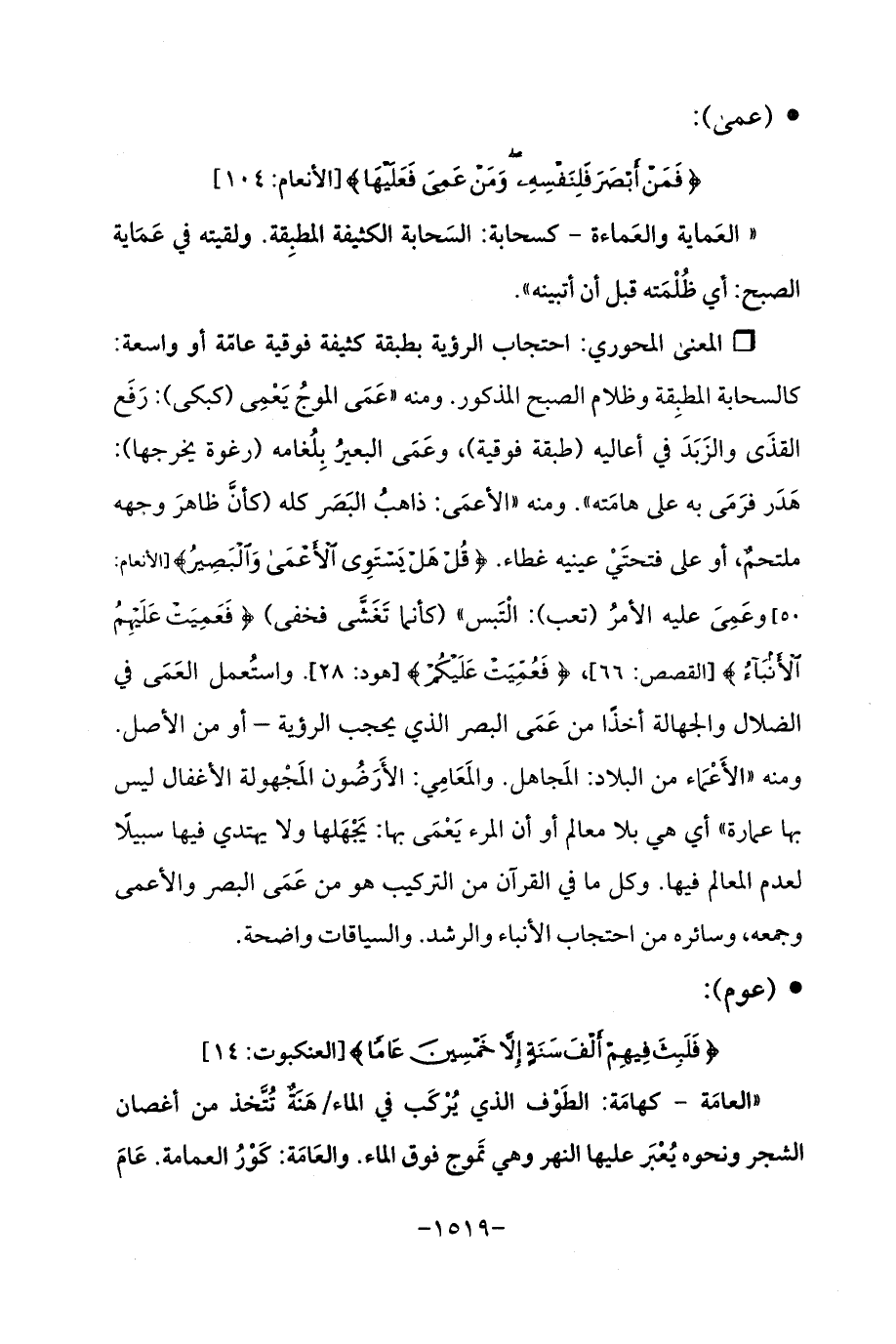 Qاحتجاب الرؤية بطبقة كثيفة فوقية عامّة أو واسعة: كالسحابة المطبِقة وظلام الصبح المذكور. ومنه "عَمَى الموجُ يَعْمِى (كبكى): رَفَع القذَى والزَبَدَ في أعاليه (طبقة فوقية)، وعَمَى البعيرُ بِلُغامه (رغوة يخرجها): هَدَر فرَمَى به على هامَته ". ومنه "الأعمَى: ذاهبُ البَصَر كله (كأنَّ ظاهرَ وجهه ملتحمٌ، أو على فتحتَيْ عينيه غطاء. {قُلْ هَلْ يَسْتَوِى الأَعْمَى وَالْبَصِيرُ} [الإنعام: 50] وعَمِىَ عليه الأمرُ (تعب): الْتَبس " (كأنما تَغَشَّى فخفى) {فَعَمِيَت عَلَيْهِمُ الْأَنبَاءُ} [القصص: 66]، {فَعُمِيَتْ عَلَيْهِمُ} [هود: 28]. واستُعمل العَمَى في الضلال والجهالة أخذًا من عَمَى البصر الذي يحجب الرؤية -أو من الأصل. ومنه "الأَعْمَاء من البلاد: المَجاهل. والمَعَامِي: الأَرَضُون المَجْهولة الأغفال ليس بها عمارة "أي هي بلا معالم أو أن المرء يَعْمَى بها: يَجْهَلها ولا يهتدي فيها سبيلًا لعدم المعالم فيها. وكل ما في القرآن من التركيب هو من عَمَى البصر والأعمى وجمعه، وسائره من احتجاب الأنباء والرشد. والسياقات واضحة.