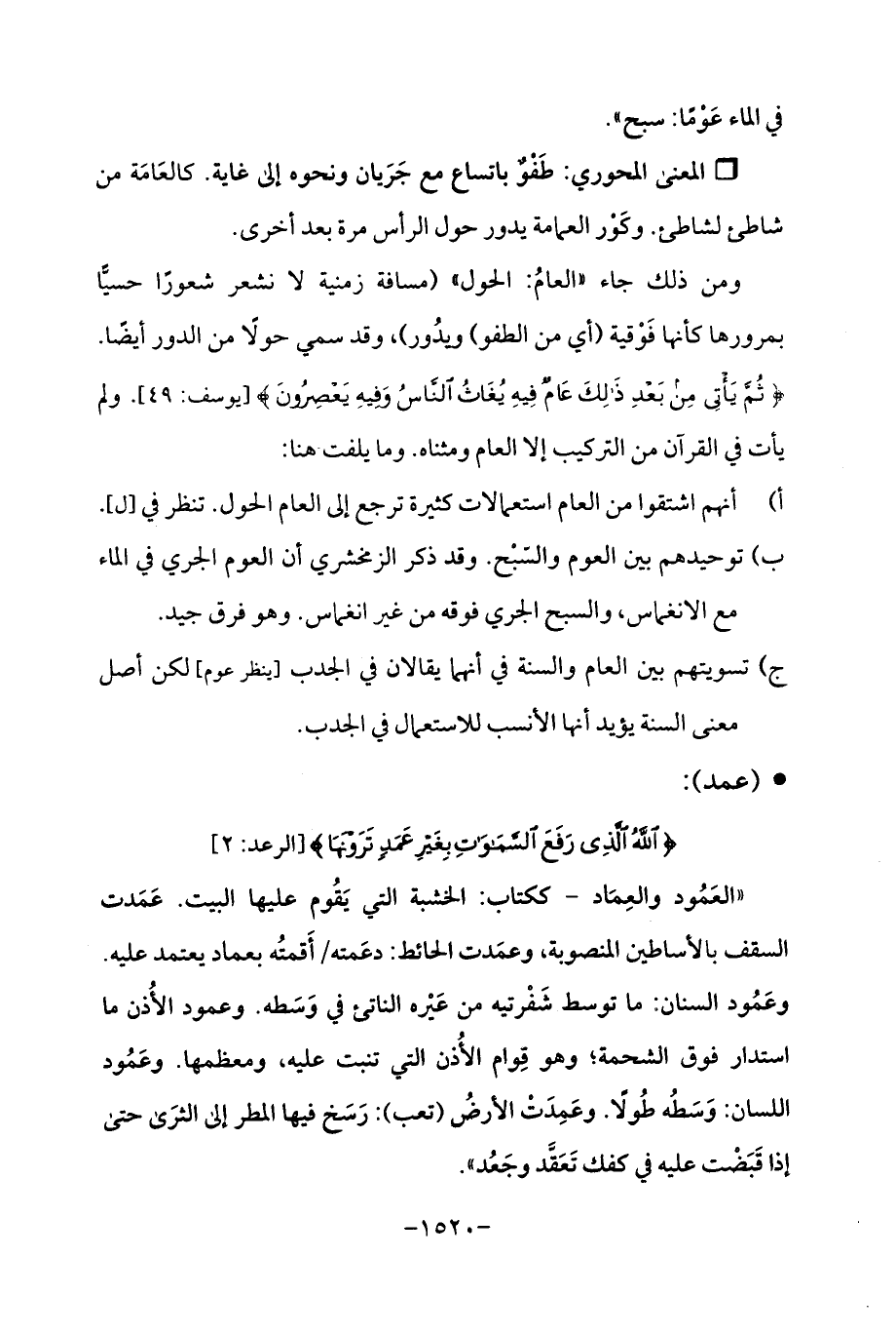 "العَمُود والعِمَاد - ككتاب: الخشبة التي يَقُوم عليها البيت. عَمَدت السقف بالأساطين المنصوبة، وعمَدت الحائط: دعَمته/ أَقمتُه بعماد يعتمد عليه. وعَمُود السنان: ما توسط شَفْرتيه من عَيْره الناتئ في وَسَطه. وعمود الأُذن ما استدار فوق الشحمة؛ وهو قِوام الأُذن التي تنبت عليه، ومعظمها. وعَمُود اللسان: وَسَطُه طُولًا. وعَمِدَتْ الأرضُ (تعب): رَسَخ فيها المطر إلى الثرَى حتى إذا قَبَضْت عليه في كفك تَعَقَّد وجَعُد ".