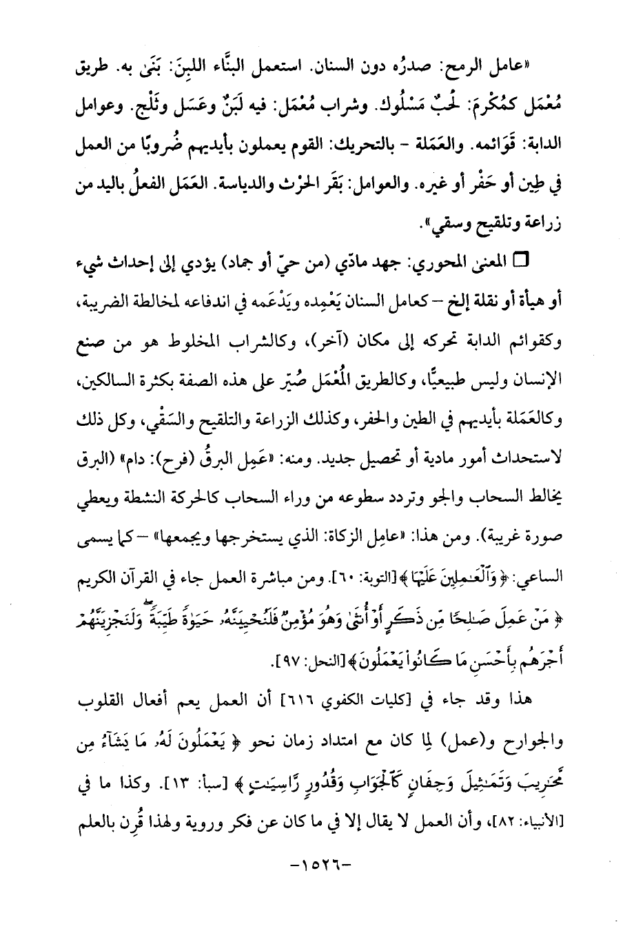 Qجهد مادّي (من حيّ أو جماد) يؤدي إلى إحداث شيء أو هيأة أو نقلة إلخ - كعامل السنان يَعْمِده ويَدْعَمه في اندفاعه لمخالطة الضريبة، وكقوائم الدابة تحركه إلى مكان (آخر)، وكالشراب المخلوط هو من صنع الإنسان وليس طبيعيًّا، وكالطريق المُعْمَل صُيّر على هذه الصفة بكثرة السالكين، وكالعَمَلة بأيديهم في الطين والحفر، وكذلك الزراعة والتلقيح والسَقْي، وكل ذلك لاستحداث أمور مادية أو تحصيل جديد. ومنه: "عَمِل البرقُ (فرح): دام " (البرق يخالط السحاب والجو وتردد سطوعه من وراء السحاب كالحركة النشطة ويعطي صورة غريبة). ومن هذا: "عامِل الزكاة: الذي يستخرجها ويجمعها "-كما يسمى الساعي: {وَالْعَامِلِينَ عَلَيْهَا} [التوبة: 60]. ومن مباشرة العمل جاء في القرآن الكريم {مَنْ عَمِلَ صَالِحًا مِنْ ذَكَرٍ أَوْ أُنْثَى وَهُوَ مُؤْمِنٌ فَلَنُحْيِيَنَّهُ حَيَاةً طَيِّبَةً وَلَنَجْزِيَنَّهُمْ أَجْرَهُمْ بِأَحْسَنِ مَا كَانُوا يَعْمَلُونَ} [النحل: 97].