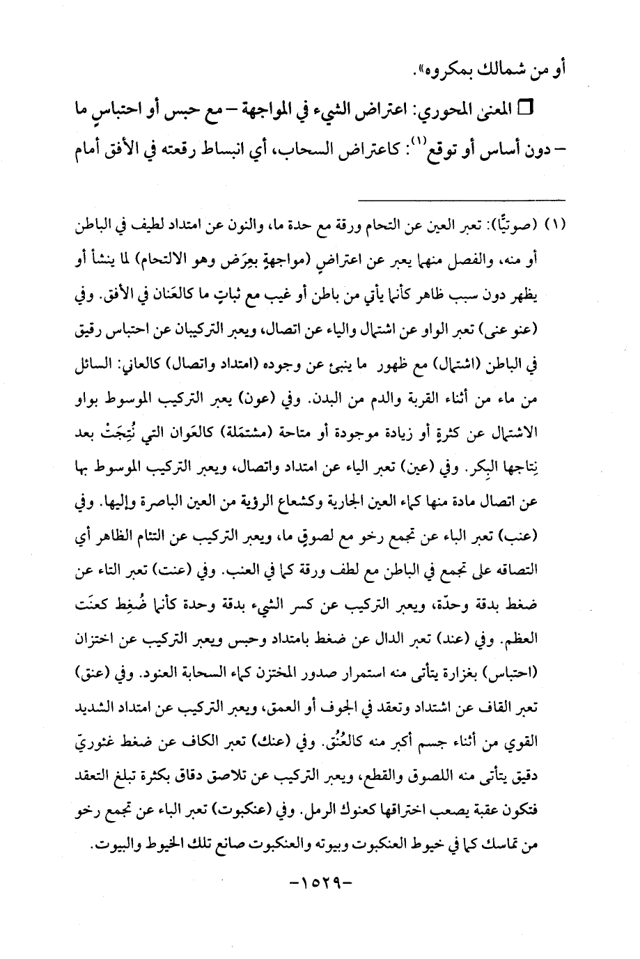 (¬1) (صوتيًّا): تعبر العين عن التحام ورقة مع حدة ما، والنون عن امتداد لطيف في الباطن أو منه، والفصل منهما يعبر عن اعتراضٍ (مواجهةٍ بعِرَض وهو الالتحام) لما ينشأ أو يظهر دون سبب ظاهر كأنما يأتي من باطن أو غيب مع ثباتٍ ما كالعَنان في الأفق. وفي (عنو عنى) تعبر الواو عن اشتمال والياء عن اتصال، ويعبر التركيبان عن احتباس رقيق في الباطن (اشتمال) مع ظهور ما ينبئ عن وجوده (امتداد واتصال) كالعاني: السائل من ماء من أثناء القربة والدم من البدن. وفي (عون) يعبر التركيب الموسوط بواو الاشتمال عن كثرةٍ أو زيادة موجودة أو متاحة (مشتمَلة) كالعَوان التي نُتِجَتْ بعد نِتاجها البِكر. وفي (عين) تعبر الياء عن امتداد واتصال، ويعبر التركيب الموسوط بها عن اتصال مادة منها كماء العين الجارية وكشعاع الرؤية من العين الباصرة وإليها. وفي (عنب) تعبر الباء عن تجمع رخو مع لصوقٍ ما، ويعبر التركيب عن التئام الظاهر أي التصاقه على تجمع في الباطن مع لطف ورقة كما في العنب. وفي (عنت) تعبر التاء عن ضغط بدقة وحدّة، ويعبر التركيب عن كسر الشيء بدقة وحدة كأنما ضُغِط كعنَت العظم. وفي (عند) تعبر الدال عن ضغط بامتداد وحبس ويعبر التركيب عن اختزان (احتباس) بغزارة يتأتى منه استمرار صدور المختزن كماء السحابة العنود. وفي (عنق) تعبر القاف عن اشتداد وتعقد في الجوف أو العمق، ويعبر التركيب عن امتداد الشديد القوي من أثناء جسم أكبر منه كالعُنُق. وفي (عنك) تعبر الكاف عن ضغط غئوريّ دقيق يتأتى منه اللصوق والقطع، ويعبر التركيب عن تلاصق دقاق بكثرة تبلغ التعقد فتكون عقبة يصعب اختراقها كعنوك الرمل. وفي (عنكبوت) تعبر الباء عن تجمع رخو من تماسك كما في خيوط العنكبوت وبيوته والعنكبوت صانع تلك الخيوط والبيوت.