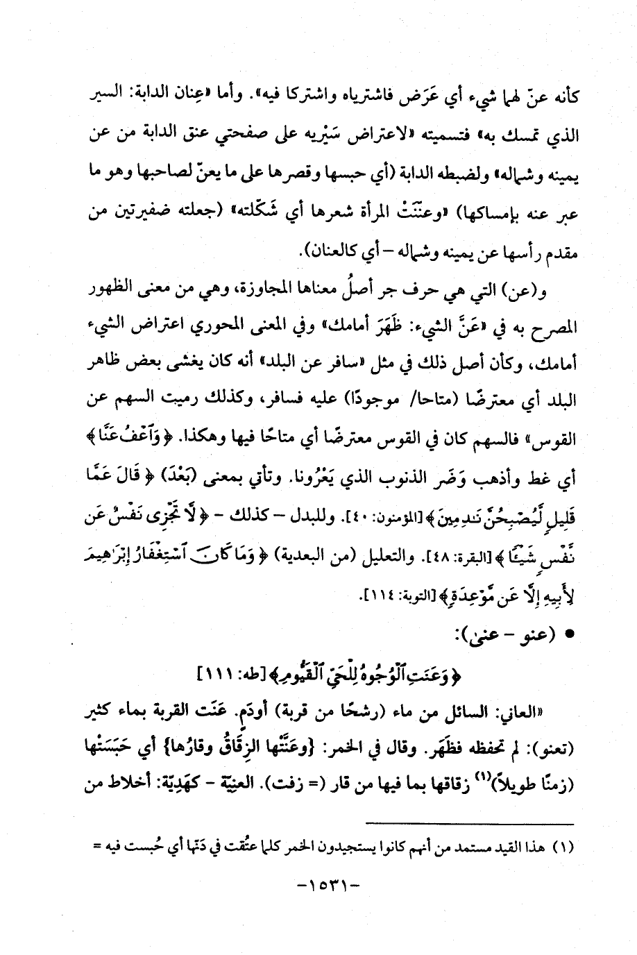 كأنه عنّ لهما شيء أى عَرَض فاشترياه واشتركا فيه ". وأما "عِنان الدابة: السير الذي تمسك به "فسميته "لاعتراض سَيْريه على صفحتي عنق الدابة من عن يمينه وشماله "ولضبطه الدابة (أي حبسها وقصرها على ما يعنّ لصاحبها وهو ما عبر عنه بإمساكها) "وعنّنَتْ المرأة شعرها أي شَكَّلته " (جعلته ضفيرتين من مقدم رأسها عن يمينه وشماله -أي كالعنان).