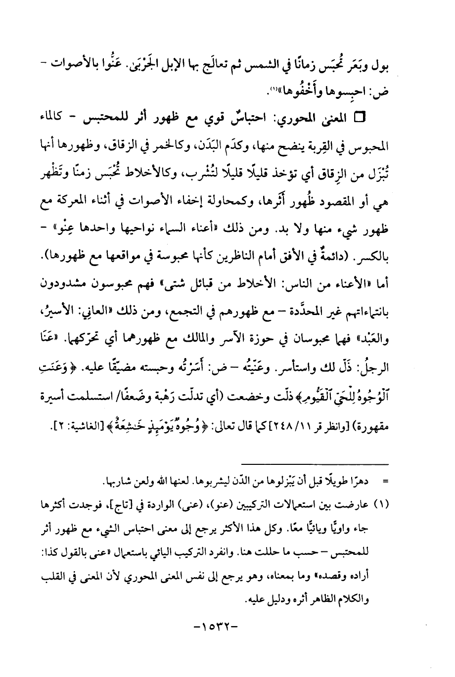 Qاحتباسٌ قوي مع ظهور أثر للمحتبس - كالماء المحبوس في القِربة ينضح منها، وكدَم البَدَن، وكالخمر في الزقاق، وظهورها أنها تُبْزَل من الزِقاق أي تؤخذ قليلًا قليلًا لتُشْرب، وكالأخلاط تُحْبَس زمنًا وتَظْهر هي أو المقصود ظُهور أَثَرها، وكمحاولة إخفاء الأصوات في أثناء المعركة مع ظهور شيء منها ولا بد. ومن ذلك "أعناء السماء نواحيها واحدها عِنْو "-بالكسر. (دائمةٌ في الأفق أمام الناظرين كأنها محبوسة في مواقعها مع ظهورها). أما "الأعناء من الناس: الأخلاط من قبائل شتى "فهم محبوسون مشدودون بانتماءاتهم غير المحدَّدة - مع ظهورهم في التجمع، ومن ذلك "العانِي: الأسيرُ، والعَبْد "فهما محبوسان في حوزة الآسر والمالك مع ظهورهما أي تحرِّكهما. "عَنَا الرجلُ: ذَلّ لك واستأسر. وعَنّيتُه - ض: أَسَرْتُه وحبسته مضيَّقًا عليه. {وَعَنَتِ الْوُجُوهُ لِلْحَيِّ الْقَيُّومِ} ذلَّت وخضعت (أي تدلَّت رَهْبة وضَعفًا/ استسلمت أسيرة مقهورة) [وانظر قر 11/ 248] كما قال تعالى: {وُجُوهٌ يَوْمَئِذٍ خَاشِعَةٌ} [الغاشية: 2].