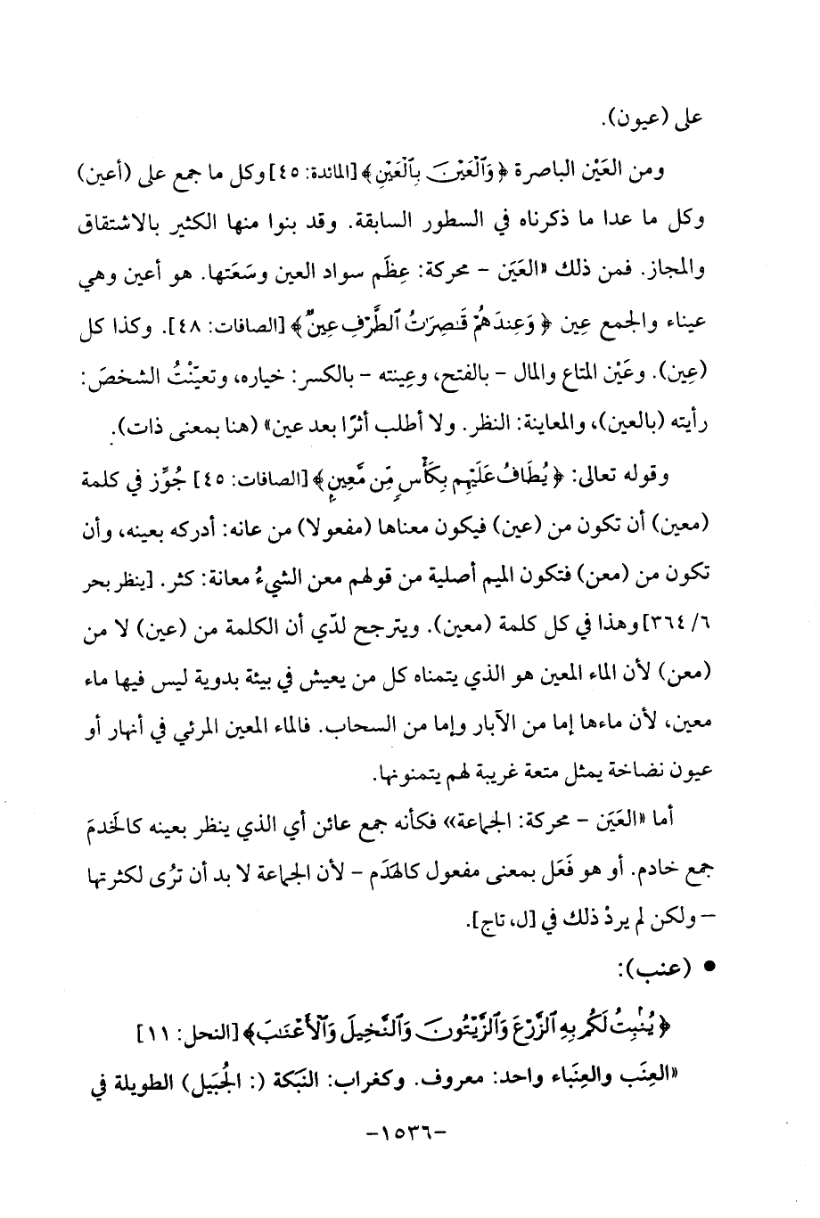 ومن العَيْن الباصرة {وَالْعَيْنَ بِالْعَيْنِ} [المائدة: 45] وكل ما جمع على (أعين) وكل ما عدا ما ذكرناه في السطور السابقة. وقد بنوا منها الكثير بالاشتقاق والمجاز. فمن ذلك "العَيَن -محركة: عِظَم سواد العين وسَعَتها. هو أعين وهي عيناء والجمع عِين {وَعِنْدَهُمْ قَاصِرَاتُ الطَّرْفِ عِينٌ} [الصافات: 48]. وكذا كل (عِين). وعَيْن المتاع والمال -بالفتح، وعِينته -بالكسر: خياره، وتعيّنْتُ الشخصَ: رأيته (بالعين)، والمعاينة: النظر. ولا أطلب أثرًا بعد عين " (هنا بمعى ذات).