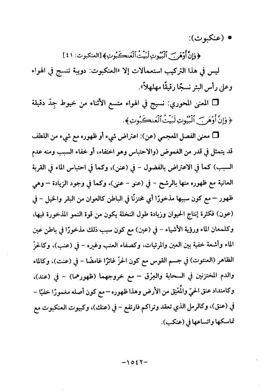 ° معنى الفصل المعجمي (عن): اعتراض شيء أو ظهوره مع شيء من اللطف قد يتمثل في قدر من الغموض (والاحتباس وهو اختفاء، أو خفاء السبب ومنه عدم السبب) كما في الاعتراض بالفضول -في (عنن)، وكما في احتباس الماء في القربة العانية مع ظهوره منها بالرشح -في (عنو - عنى)، وكما في وجود الزيادة -وهي ظهور- مع كون سببها مذخورًا أي مختزنًا في الباطن كالعوان من البقر والخيل -في (عون) فكرة إنتاج الحيوان وزيادة طول النخلة يكون من قوة النمو المذخورة فيها، وكلمعان الماء ورؤية الأشياء -في (عين) مع كون سبب ذلك مذخورًا في باطن عين الماء وأشعة خفية بين العين والمرئيات، وكصفاء العنب وغيره -في (عنب)، وكالحزّ الظاهر (العنتوت) في جسم القوس مع كون الحزّ غائرًا غامضًا -في (عنت)، وكالماء والدم المختزنين في السحابة والعِرْق - مع خروجهما (ظهورهما) -في (عند)، وكامتداد عنق الحيّ والمُعْنِق من الأرض وهذا ظهوره - مع كون أصله مغمورًا خفيًا -في (عنق)، وكالرمل الذي تعقد وتراكم فارتفع -في (عنك)، وكبيوت العنكبوت مع تماسكها واتساعها في (عنكب).