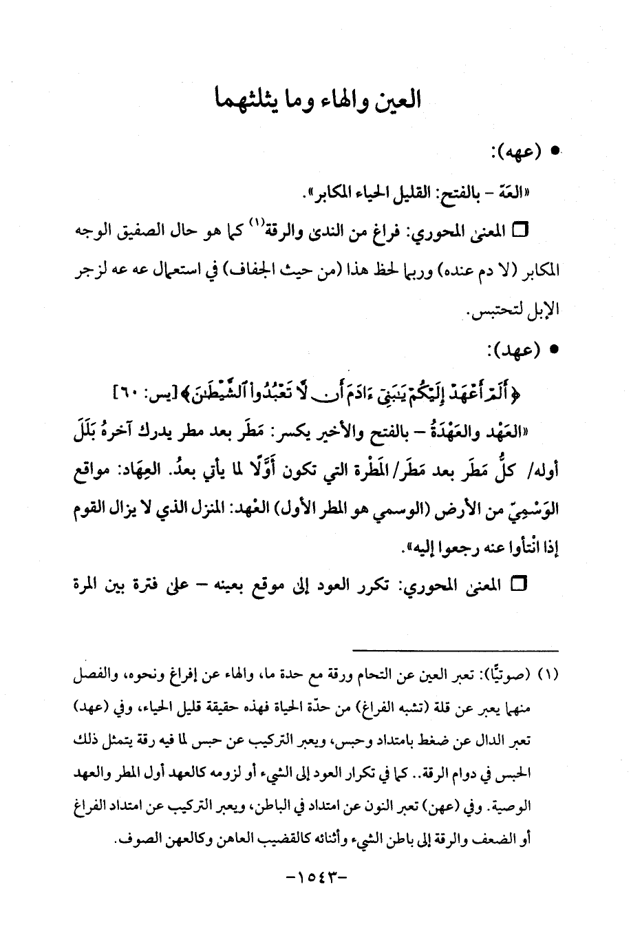 (¬1) (صوتيًّا): تعبر العين عن التحام ورقة مع حدة ما، والهاء عن إفراغ ونحوه، والفصل منهما يعبر عن قلة (تشبه الفراغ) من حدّة الحياة فهذه حقيقة قليل الحياء، وفي (عهد) تعبر الدال عن ضغط بامتداد وحبس، ويعبر التركيب عن حبس لما فيه رقة يتمثل ذلك الحبس في دوام الرقة. . كما في تكرار العود إلى الشيء أو لزومه كالعهد أول المطر والعهد الوصية. وفي (عهن) تعبر النون عن امتداد في الباطن، ويعبر التركيب عن امتداد الفراغ أو الضعف والرقة إلى باطن الشيء وَأثنائه كالقضيب العاهن وكالعهن الصوف.