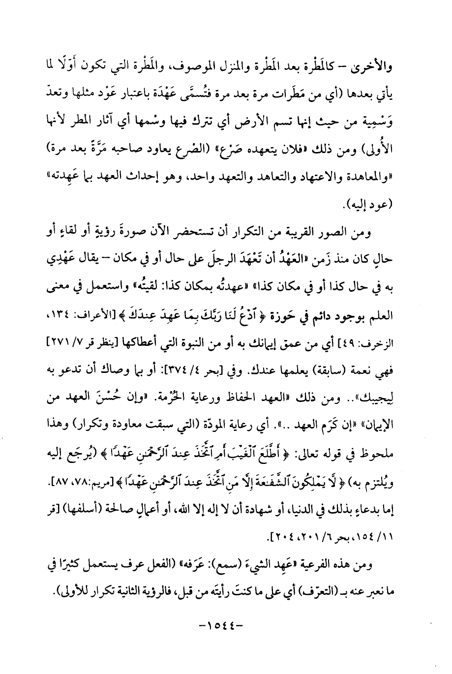 ومن الصور القريبة من التكرار أن تستحضر الآن صورةَ رؤيةٍ أو لقاءٍ أو حالٍ كان منذ زَمن "العَهْدُ أن تَعْهَدَ الرجلَ على حال أو في مكان - يقال عَهْدِي به في حال كذا أو في مكان كذا ""عهدتُه بمكان كذا: لقيتُه "واستعمل في معنى العلم بوجود دائم في حَوزة {ادْعُ لَنَا رَبَّكَ بِمَا عَهِدَ عِنْدَكَ} [الأعراف: 134، الزخرف: 49] أي من عمق إيمانك به أو من النبوة التي أعطاكها [ينظر قر 7/ 271] فهي نعمة (سابقة) يعلمها عندك. وفي [بحر 4/ 374]: أو بما وصاك أن تدعو به ليجيبك ". . ومن ذلك "العهد الحفاظ ورعاية الحُرْمة. "وإن حُسْنَ العهد من الإيمان ""إن كَرَم العهد. . ". أي رعاية المودّة (التي سبقت معاودة وتكرار) وهذا ملحوظ في قوله تعالى: {أَطَّلَعَ الْغَيْبَ أَمِ اتَّخَذَ عِنْدَ الرَّحْمَنِ عَهْدًا} (يُرجَع إليه ويُلتزم به) {لَا يَمْلِكُونَ الشَّفَاعَةَ إِلَّا مَنِ اتَّخَذَ عِنْدَ الرَّحْمَنِ عَهْدًا} [مريم: 78, 87]. إما بدعاءٍ بذلك في الدنيا، أو شهادة أن لا إله إلا اللَّه، أو أعمالٍ صالحة (أسلفها) [قر 11/ 154، بحر 6/ 201، 204].