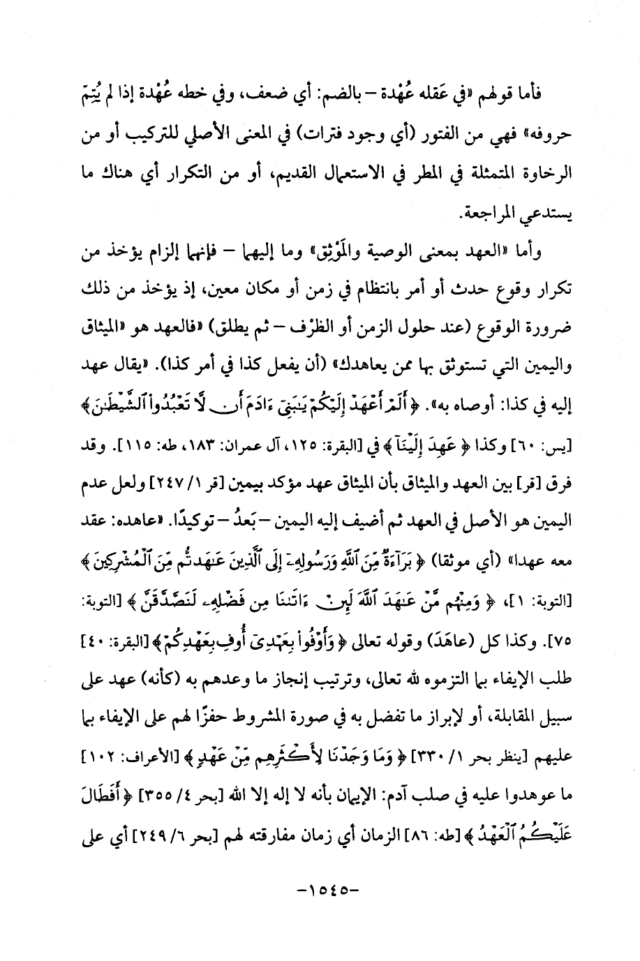 وأما "العهد بمعى الوصية والمَوْثِق "وما إليهما - فإنهما إلزام يؤخذ من تكرار وقوع حدث أو أمر بانتظام في زمن أو مكان معين، إذ يؤخذ من ذلك ضرورة الوقوع (عند حلول الزمن أو الظرْف - ثم يطلق) "فالعهد هو "الميثاق واليمين التي تستوثق بها ممن يعاهدك " (أن يفعل كذا في أمر كذا). "يقال عهد إليه في كذا: أوصاه به ". {أَلَمْ أَعْهَدْ إِلَيْكُمْ يَابَنِي آدَمَ أَنْ لَا تَعْبُدُوا الشَّيْطَانَ} [يس: 60] وكذا {عَهِدَ إِلَيْنَا} في [البقرة: 125، آل عمران: 183، طه: 115]. وقد فرق [قر] بين العهد والميثاق بأن الميثاق عهد مؤكد بيمين [قر 1/ 247] ولعل عدم اليمين هو الأصل في العهد ثم أضيف إليه اليمين -بَعدُ- توكيدًا. "عاهده: عقد معه عهدا "، (أي موثقا) {بَرَاءَةٌ مِنَ اللَّهِ وَرَسُولِهِ إِلَى الَّذِينَ عَاهَدْتُمْ مِنَ الْمُشْرِكِينَ} [التوبة: 1]، {وَمِنْهُمْ مَنْ عَاهَدَ اللَّهَ لَئِنْ آتَانَا مِنْ فَضْلِهِ لَنَصَّدَّقَنَّ} [التوبة: 75]. وكذا كل (عاهَدَ) وقوله تعالى {وَأَوْفُوا بِعَهْدِي أُوفِ بِعَهْدِكُمْ} [البقرة: 40] طلب الإيفاء بما التزموه للَّه تعالى، وترتيب إنجاز ما وعدهم به (كأنه) عهد على سبيل المقابلة، أو لإبراز ما تفضل به في صورة المشروط حفزًا لهم على الإيفاء بما عليهم [ينظر بحر 1/ 330] {وَمَا وَجَدْنَا لِأَكْثَرِهِمْ مِنْ عَهْدٍ} [الأعراف: 102] ما عوهدوا عليه في صلب آدم: الإيمان بأنه لا إله إلا اللَّه [بحر 4/ 355] {أَفَطَالَ عَلَيْكُمُ الْعَهْدُ} [طه: 86] الزمان أي زمان مفارقته لهم [بحر 6/ 249] أي على