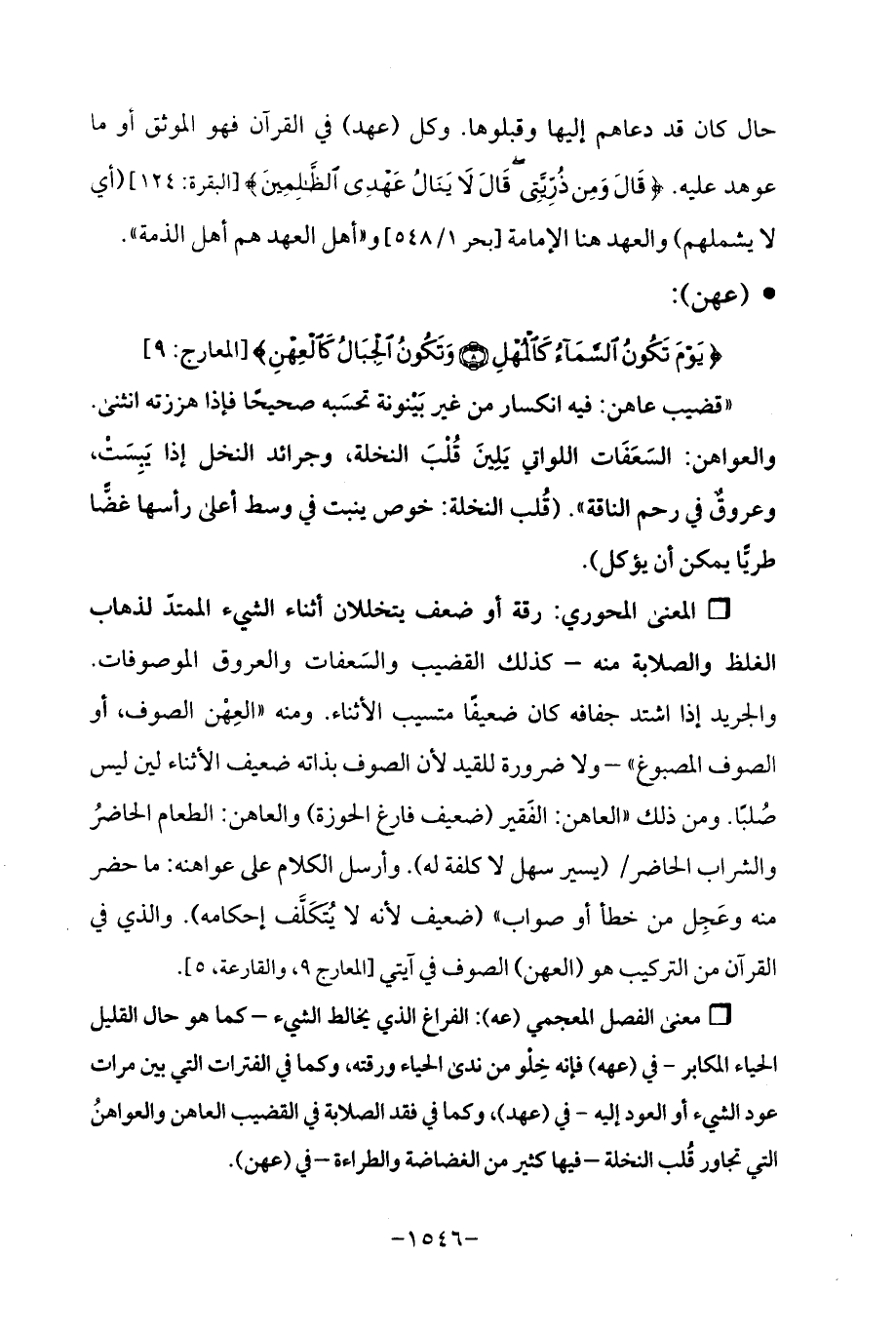 Qرقة أو ضعف يتخللان أثناء الشيء الممتدّ لذهاب الغلظ والصلابة منه - كذلك القضيب والسَعفات والعروق الموصوفات. والجريد إذا اشتد جفافه كان ضعيفًا متسيب الأثناء. ومنه "العِهْن الصوف، أو الصوف المصبوغ "- ولا ضرورة للقيد لأن الصوف بذاته ضعيف الأثناء لين ليس صُلبًا. ومن ذلك "العاهن: الفَقير (ضعيف فارغ الحوزة) والعاهن: الطعام الحاضرُ والشراب الحاضر/ (يسير سهل لا كلفة له). وأرسل الكلام على عواهنه: ما حضر منه وعَجِل من خطأ أو صواب " (ضعيف لأنه لا يُتَكَلَّف إحكامه). والذي في القرآن من التركيب هو (العهن) الصوف في آيتي [المعارج 9، والقارعة 5].