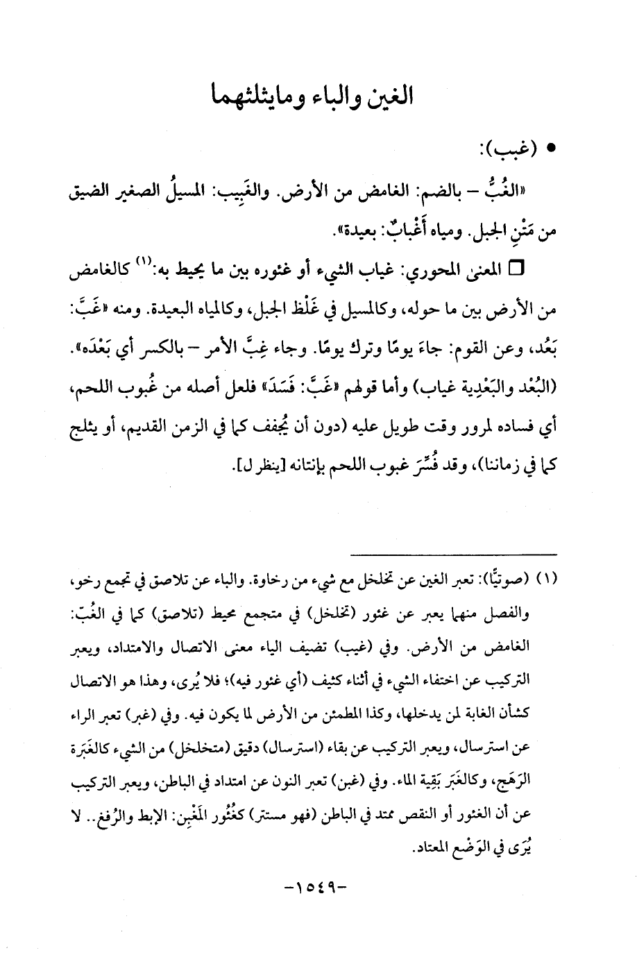 (¬1) (صوتيًّا): تعبر الغين عن تخلخل مع شيء من رخاوة. والباء عن تلاصق في تجمع رخو، والفصل منهما يعبر عن غئور (تخلخل) في متجمع محيط (تلاصق) كما في الغُبّ: الغامض من الأرض. وفي (غيب) تضيف الياء معنى الاتصال والامتداد، ويعبر التركيب عن اختفاء الشيء في أثناء كثيف (أي غئور فيه)؛ فلا يُرى، وهذا هو الاتصال كشأن الغابة لمن يدخلها، وكذا المطمئن من الأرض لما يكون فيه. وفي (غبر) تعبر الراء عن استرسال، ويعبر التركيب عن بقاء (استرسال) دقيق (متخلخل) من الشيء كالغَبَرة الرَهَج، وكالغَبَر بَقِية الماء. وفي (غبن) تعبر النون عن امتداد في الباطن، ويعبر التركيب عن أن الغئور أو النقص ممتد في الباطن (فهو مستتر) كغُئُور المَغْبِن: الإبط والرُفغ. . لا يُرَى في الوَضْع المعتاد.
