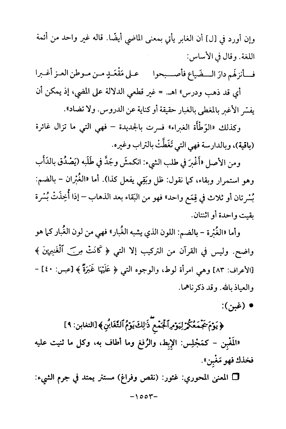 أي قد ذهب ودرس "اهـ. = غير قطعي الدلالة على المضي، إذ يمكن أن يفسّر الأغبر بالمغطى بالغيار حقيقة أو كناية عن الدروس. ولا تضاد ".