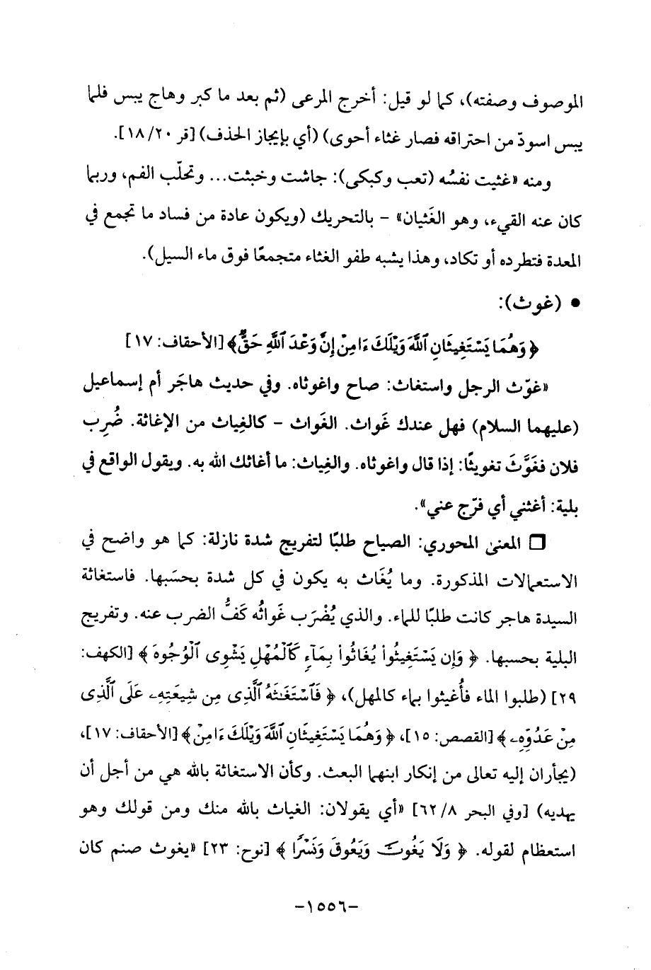 Qالصياح طلبًا لتفريج شدة نازلة: كما هو واضح في الاستعمالات المذكورة. وما يُغَاث به يكون في كل شدة بحسَبها. فاستغاثة السيدة هاجر كانت طلبًا للماء. والذي يُضْرَب غَواثُه كَفُّ الضرب عنه. وتفريج البلية بحسبها. {وَإِنْ يَسْتَغِيثُوا يُغَاثُوا بِمَاءٍ كَالْمُهْلِ يَشْوِي الْوُجُوهَ} [الكهف: 29] (طلبوا الماء فأُغيثوا بماء كالمهل)، {فَاسْتَغَاثَهُ الَّذِي مِنْ شِيعَتِهِ عَلَى الَّذِي مِنْ عَدُوِّهِ} [القصص: 15]، {وَهُمَا يَسْتَغِيثَانِ اللَّهَ وَيْلَكَ آمِنْ} [الأحقاف: 17]، (يجأران إليه تعالى من إنكار ابنهما البعث. وكأن الاستغاثة باللَّه هي من أجل أن يهديه) [وفي البحر 8/ 62] "أي يقولان: الغياث باللَّه منك ومن قولك وهو استعظام لقوله. {وَلَا يَغُوثَ وَيَعُوقَ وَنَسْرًا} [نوح: 23] "يغوث صنم كان