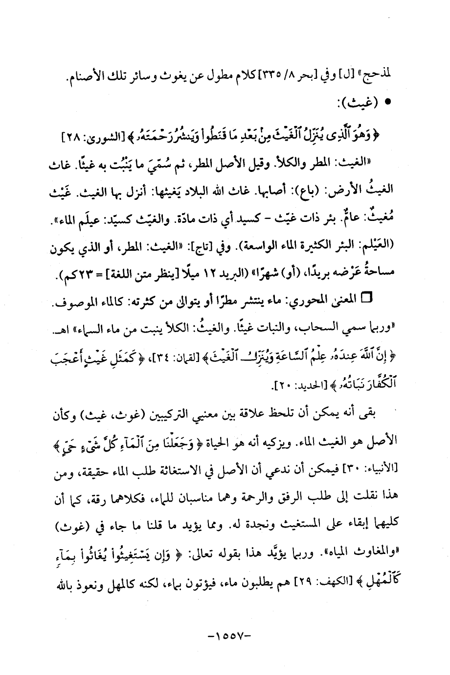 بقى أنه يمكن أن تلحظ علاقة بين معنيي التركيبين (غوث، غيث) وكأن الأصل هو الغيث الماء. ويزكيه أنه هو الحياة {وَجَعَلْنَا مِنَ الْمَاءِ كُلَّ شَيْءٍ حَيٍّ} [الأنبياء: 30] فيمكن أن ندعي أن الأصل في الاستغاثة طلب الماء حقيقة، ومن هذا نقلت إلى طلب الرفق والرحمة وهما مناسبان للماء، فكلاهما رقة، كما أن كليهما إبقاء على المستغيث ونجدة له. ومما يؤيد ما قلنا ما جاء في (غوث) "والمغاوث المياه ". وربما يؤيَّد هذا بقوله تعالى: {وَإِنْ يَسْتَغِيثُوا يُغَاثُوا بِمَاءٍ كَالْمُهْلِ} [الكهف: 29] هم يطلبون ماء، فيؤتون بماء، لكنه كالمهل ونعوذ باللَّه