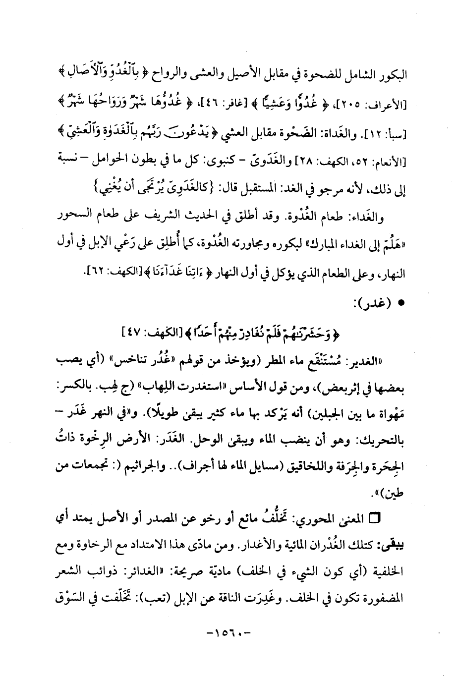 "الغدير: مُسْتَنْقَع ماء المطر (ويؤخذ من قولهم "غُدُر تناخس " (أي يصب بعضها في إثر بعض)، ومن قول الأساس "استغدرت اللِهاب " (ج لِهب. بالكسر: مَهْواة ما بين الجبلين) أنه يَرْكد بها ماء كثير يبقى طويلًا). و "في النهر غَدَر -بالتحريك: وهو أن ينضب الماء ويبقى الوحل. الغَدَر: الأرض الرِخْوة ذاتُ الجِحَرة والجِرَفة واللخاقيق (مسايل الماء لها أجراف). . والجراثيم (: تجمعات من طين) ".