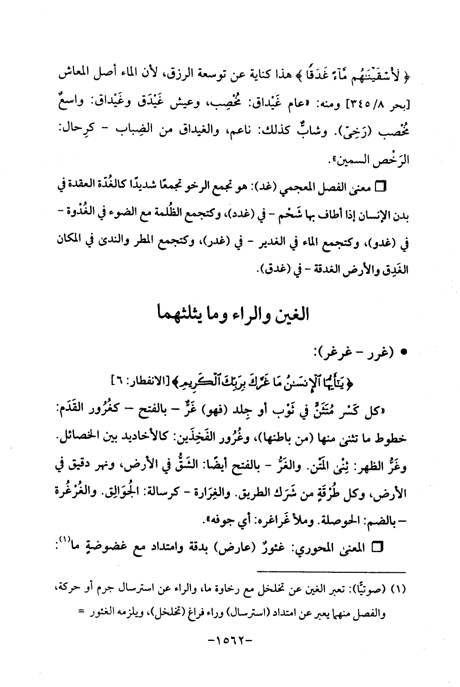 (¬1) (صوتيًّا): تعبر الغين عن تخلخل مع رخاوة ما، والراء عن استرسال جرم أو حركة، والفصل منهما يعبر عن امتداد (استرسال) وراء فراغ (تخلخل)، ويلزمه الغئور =