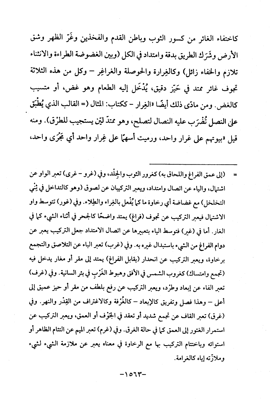 = (إلى عمق الفراغ واللحاق به) كغرور الثوب والجِلْد، وفي (غرو - غرى) تعبر الواو عن اشتمال، والياء عن اتصال وامتداد، ويعبر التركيبان عن لصوق (وهو كالتداخل في ثِنْي التخلخل) مع غضاضة أي رخاوة ما كما يُفْعل بالغِراء والطِلاء. وفي (غور) تتوسط واو الاشتمال فيعبر التركيب عن تجوف (فراغ) يمتد واضحًا كالجحر في أثناء الشيء كما في الغار. أما في (غير) فتوسط الياء بتعبيرها عن اتصال الامتداد جعل التركيب يعبر عن دوام الفراغ من الشيء باستبدال غيره به. وفي (غرب) تعبر الباء عن التلاصق والتجمع برخاوة، ويعبر التركيب عن انحدار (يقابل الفراغ) يمتد إلى مقر أو مغار يدخل فيه (تجمع وامتساك) كغروب الشمس في الأفق وهبوط الغَرْبِ في بئر السانية. وفي (غرف) تعبر الفاء عن إبعاد وطرْد، ويعبر التركيب عن رفع بلطف من مقر أو حيز عميق إلى أعلى - وهذا فصل وتفريق كالإبعاد - كالغُرْفة وكالاغتراف من القِدْر والنهر. وفي (غرق) تعبر القاف عن تجمع شديد أو تعقد في الجَوْف أو العمق، ويعبر التركيب عن استمرار الغئور إلى العمق كما في حالة الغرق. وفي (غرم) تعبر الميم عن التئام الظاهر أو استوائه وباختتام التركيب بها مع الرخاوة في معناه يعبر عن ملازمة الشيء لشيء وملازته إياه كالغرامة.