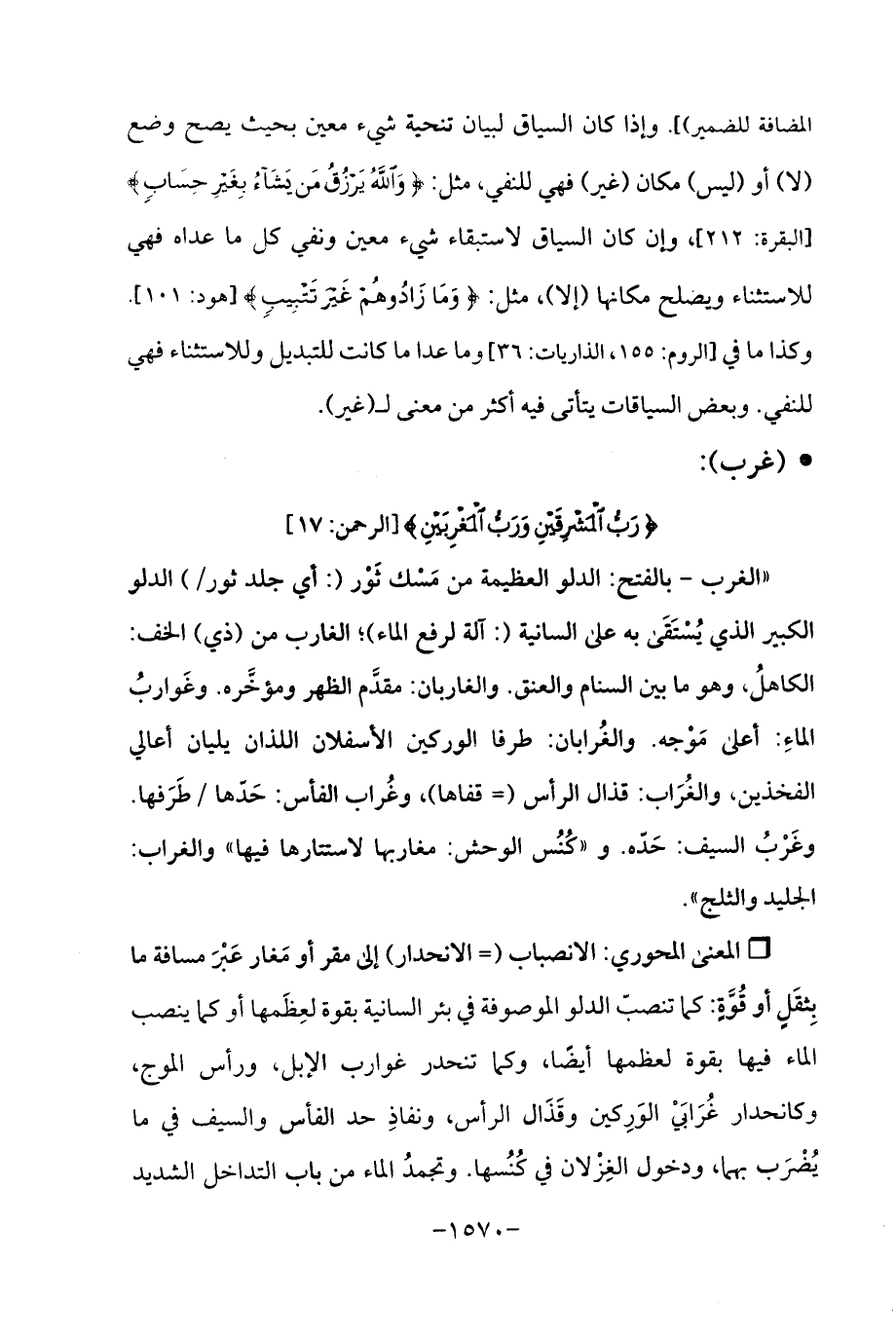 المضافة للضمير)]. وإذا كان السياق لبيان تنحية شيء معين بحيث يصح وضع (لا) أو (ليس) مكان (غير) فهي للنفي، مثل: {وَاللَّهُ يَرْزُقُ مَنْ يَشَاءُ بِغَيْرِ حِسَابٍ} [البقرة: 212]، وإن كان السياق لاستبقاء شيء معين ونفي كل ما عداه فهي للاستثناء ويصلح مكانها (إلا)، مثل: {وَمَا زَادُوهُمْ غَيْرَ تَتْبِيبٍ} [هود: 101]. وكذا ما في [الروم: 155، الذاريات: 36] وما عدا ما كانت للتبديل وللاستثناء فهي للنفي. وبعض السياقات يتأتى فيه أكثر من معنى لـ (غير).