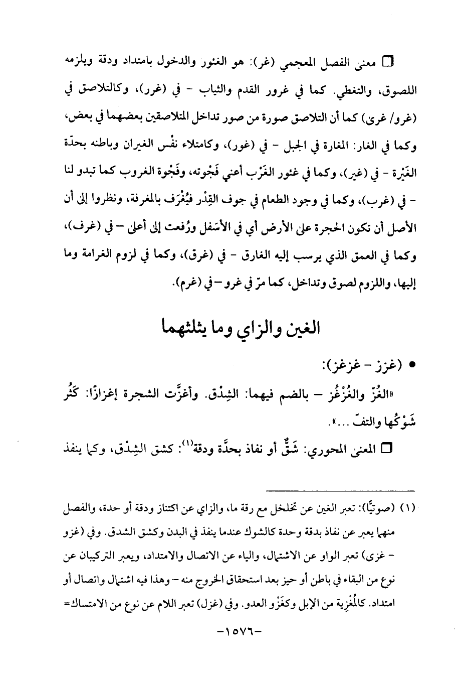 (¬1) (صوتيًّا): تعبر الغين عن تخلخل مع رقة ما، والزاي عن اكتناز ودقة أو حدة، والفصل منهما يعبر عن نفاذ بدقة وحدة كالشوك عندما ينفذ في البدن وكشق الشدق. وفي (غزو - غزى) تعبر الواو عن الاشتمال، والياء عن الاتصال والامتداد، ويعبر التركيبان عن نوع من البقاء في باطن أو حيز بعد استحقاق الخروج منه - وهذا فيه اشتمال واتصال أو امداد. كالمُغْزِية من الإبل وكغَزْو العدو. وفي (غزل) تعبر اللام عن نوع من الامتساك =