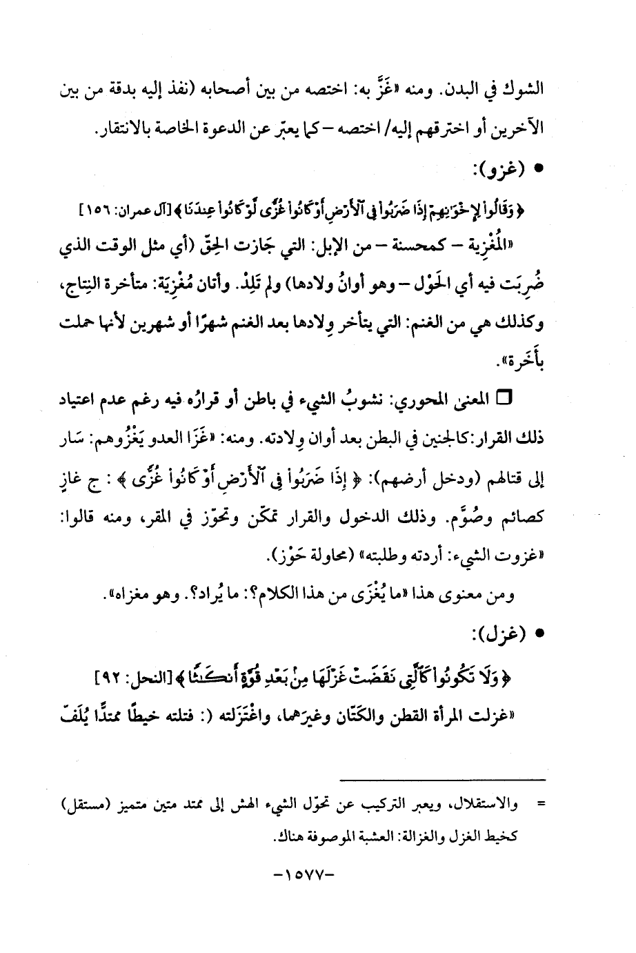Qنشوبُ الشيء في باطن أو قرارُه فيه رغم عدم اعتياد ذلك القرار: كالجنين في البطن بعد أوان وِلادته. ومنه: "غزَا العدو يَغْزُوهم: سَار إلى قتالهم (ودخل أرضهم): {إِذَا ضَرَبُوا فِي الْأَرْضِ أَوْ كَانُوا غُزًّى}: ج غازٍ كصائم وصُوَّم. وذلك الدخول والقرار تمكّن وتحوّز في المقر، ومنه قالوا: "غزوت الشيء: أردته وطلبته " (محاولة حَوْز).