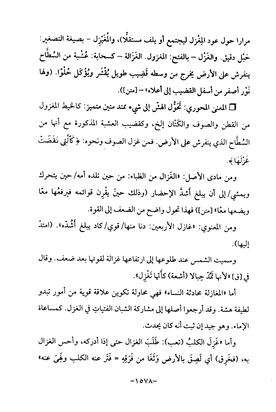 مرارا حول عود المِغْزل ليجتمع أو يلف مستقلًّا)، والمُغَيْزِل -بصيغة التصغير: حَبْل دقيق. والغَزْل -بالفتح: المغزول. الغَزَالة - كسحابة: عُشْبة من السُطَّاح ينفرش على الأرض يخرج من وسطه قَضِيب طويل يُقْشَر ويُؤكَل حُلْوًا. (ولها نَوْر أصفر من أسفل القضيب إلى أعلاه "-[متن]).