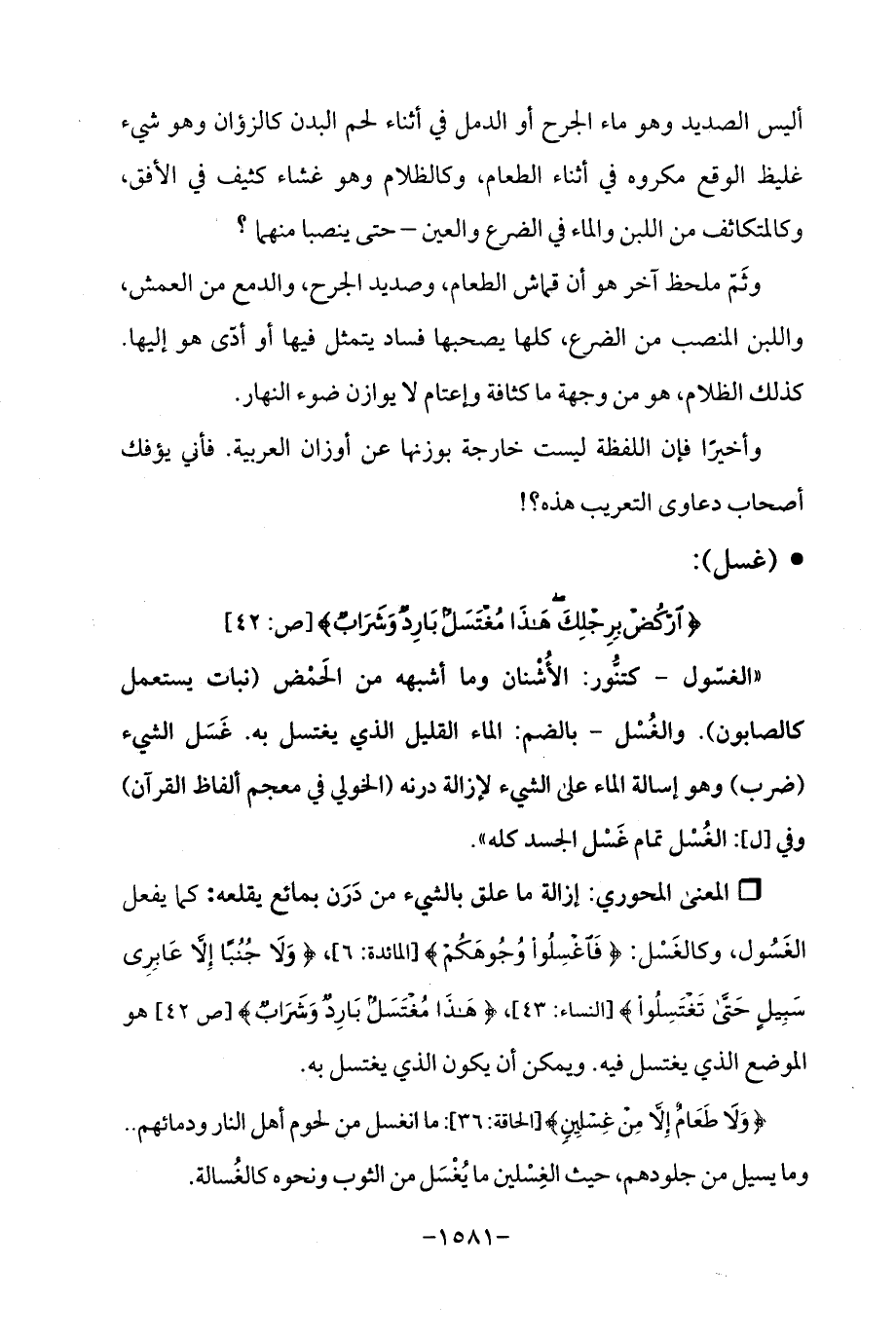 Qإزالة ما علق بالشيء من دَرَن بمائع يقلعه: كما يفعل الغَسُول، وكالغَسْل: {فَاغْسِلُوا وُجُوهَكُمْ} [المائدة: 6]، {وَلَا جُنُبًا إِلَّا عَابِرِي سَبِيلٍ حَتَّى تَغْتَسِلُوا} [النساء: 43]، {هَذَا مُغْتَسَلٌ بَارِدٌ وَشَرَابٌ} [ص: 42] هو الموضع الذي يغتسل فيه. ويمكن أن يكون الذي يغتسل به.