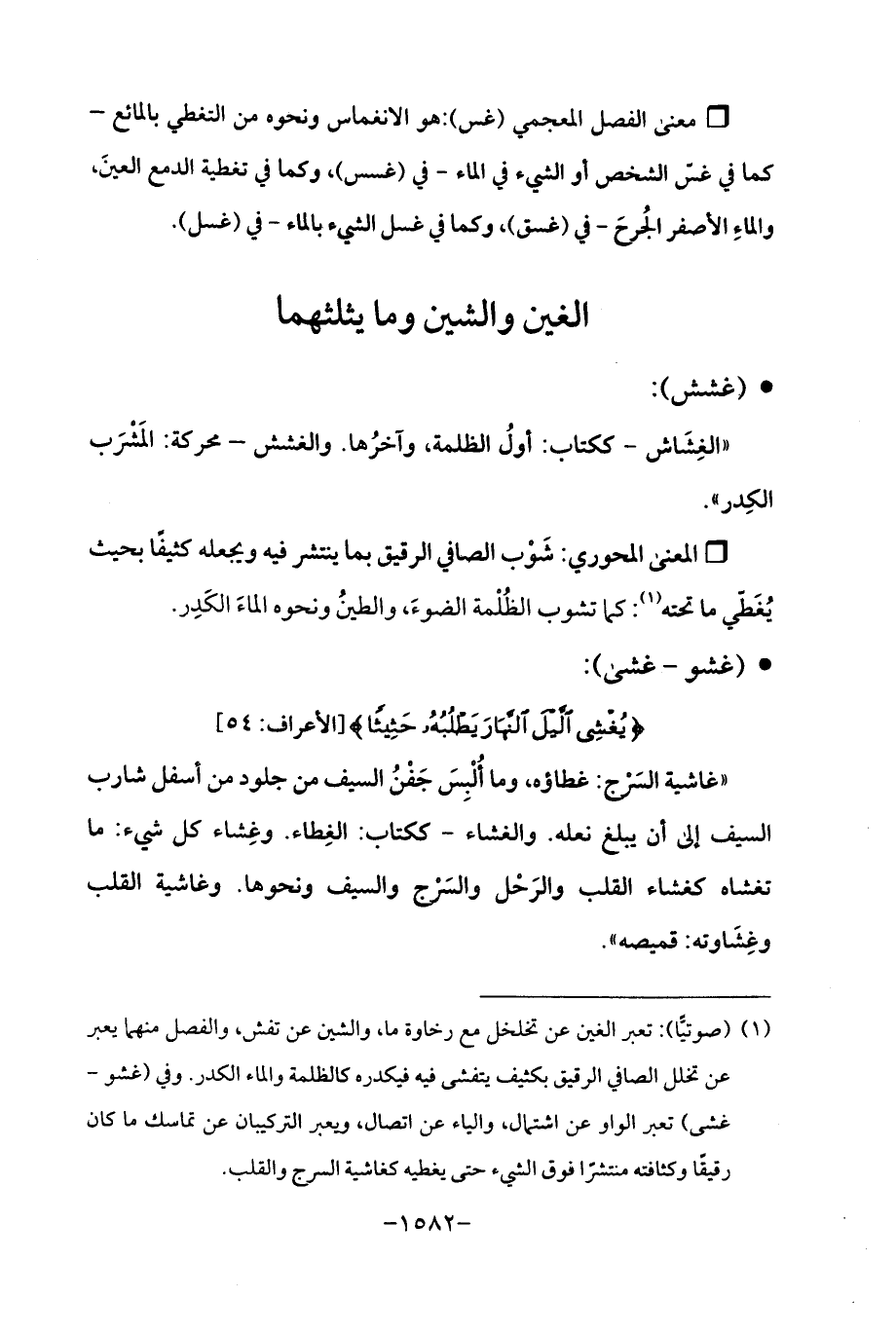(¬1) (صوتيًّا): تعبر الغين عن تخلخل مع رخاوة ما، والشين عن تفش، والفصل منهما يعبر عن تخلل الصافي الرقيق بكثيف يتفشى فيه فيكدره كالظلمة والماء الكدر. وفي (غشو - غشى) تعبر الواو عن اشتمال، والياء عن اتصال، ويعبر التركيبان عن تماسك ما كان رقيقًا وكثافته منتشرًا فوق الشيء حتى يغطيه كغاشية السرج والقلب.