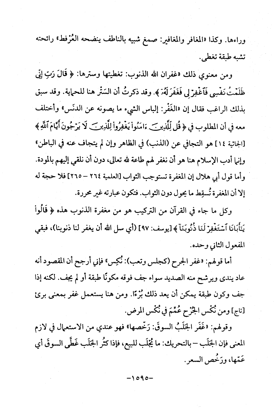 ومن معنوي ذلك "غفران اللَّه الذنوب: تغطيتها وسترها: {قَالَ رَبِّ إِنِّي ظَلَمْتُ نَفْسِي فَاغْفِرْ لِي فَغَفَرَ لَهُ}. وقد ذكرتُ أن السَتْر هنا للحماية. وقد سبق بذلك الراغب فقال إن "الغَفْر: إلباس الشيء ما يصونه عن الدنَس "وأختلف معه في أن المطلوب في {قُلْ لِلَّذِينَ آمَنُوا يَغْفِرُوا لِلَّذِينَ لَا يَرْجُونَ أَيَّامَ اللَّهِ} [الجاثية: 14] هو التجافي عن (الذنب) في الظاهر وإن لم يتجاف عنه في الباطن "وإنما أدب الإسلام هنا هو أن نغفر لهم طاعة للَّه تعالى، دون أن نلقي إليهم بالمودة. وأما قول أبي هلال إن المغفرة تستوجب الثواب [العلمية 264 - 265] فلا حجة له إلا أن المغفرة تُسقِط ما يحول دون الثواب. فتكون عبارته غير محررة.