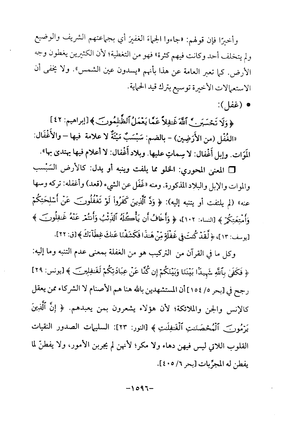 وكل ما في القرآن من التركيب هو من الغفلة بمعنى عدم التنبه وما إليه: {فَكَفَى بِاللَّهِ شَهِيدًا بَيْنَنَا وَبَيْنَكُمْ إِنْ كُنَّا عَنْ عِبَادَتِكُمْ لَغَافِلِينَ} [يونس: 29] رجح في [بحر 5/ 154] أن المستشهدين باللَّه هنا هم الأصنام لا الشركاء ممن يعقل كالإنس والجن والملائكة؛ لأن هؤلاء يشعرون بمن يعبدهم. {إِنَّ الَّذِينَ يَرْمُونَ الْمُحْصَنَاتِ الْغَافِلَاتِ} [النور: 23]: السليمات الصدور النقيات القلوب اللاتي ليس فيهن دهاء ولا مكر؛ لأنهن لم يجربن الأمور، ولا يفطنّ لما يفطن له المجرِّبات [بحر 6/ 405].