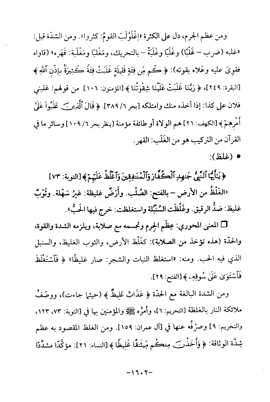 ومن الشدة البالغة مع الحدّة {عَذَابٍ غَلِيظٍ} (حيثما جاءت)، ووصْفُ ملائكة النار بالغلظة [التحريم: 6]، وأمرُه -صلى اللَّه عليه وسلم- والمؤمنين بها في [التوبة: 73، 123، والتحريم: 9] وصرْفُه عنها في [آل عمران: 159]. ومن الغلظ المقصود به عظم شدَّة الوثاقة: {وَأَخَذْنَ مِنْكُمْ مِيثَاقًا غَلِيظًا} [النساء: 21]: مؤكَّدًا مشدَّدًا