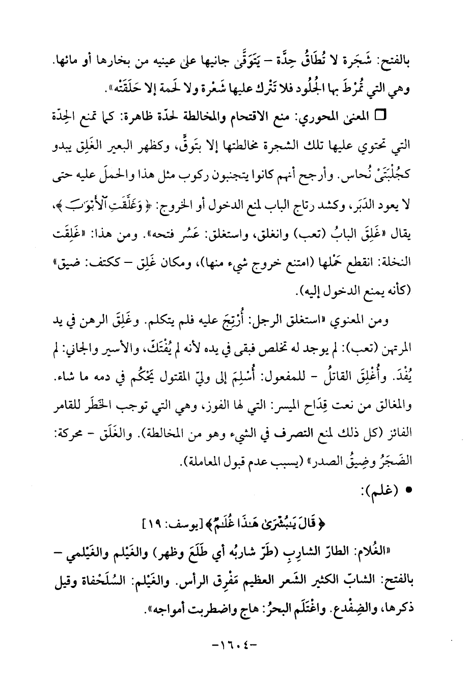 Qمنع الاقتحام والمخالطة لحدّة ظاهرة: كما تمنع الحِدّة التي تحتوي عليها تلك الشجرة مخالطتها إلا بتَوقٍّ، وكظهر البعير الغَلِق يبدو كجُلْبَتَىْ نُحاس. وأرجح أنهم كانوا يتجنبون ركوب مثل هذا والحملَ عليه حتى لا يعود الدَبَر، وكشد رتاج الباب لمنع الدخول أو الخروج: {وَغَلَّقَتِ الْأَبْوَابَ}، يقال "غَلِقَ البابُ (تعب) وانغلق، واستغلق: عَسُر فتحه ". ومن هذا: "غَلِقَت النخلة: انقطع حَمْلها (امتنع خروج شيء منها)، ومكان غَلِق - ككتف: ضيق " (كأنه يمنع الدخول إليه).