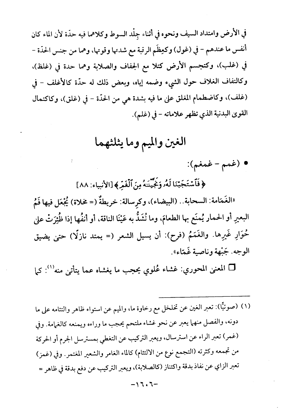 (¬1) (صوتيًّا): تعبر الغين عن تخلخل مع رخاوة ما، والميم عن استواء ظاهر والتئامه على ما دونه، والفصل فهما يعبر عن نحو غشاء ملتحم يحجب ما وراءه ويمنعه كالغمامة. وفي (غمر) تعبر الراء عن استرسال، ويعبر التركيب عن التغطي بمسترسل الجرم أو الحركة من تجمعه وكثرته (التجمع نوع من الالتئام) كالماء الغامر والشعير المغتمر. وفي (غمز) تعبر الزاي عن نفاذ بدقة واكتناز (كالصلابة)، ويعبر التركيب عن دفع بدقة في ظاهر =