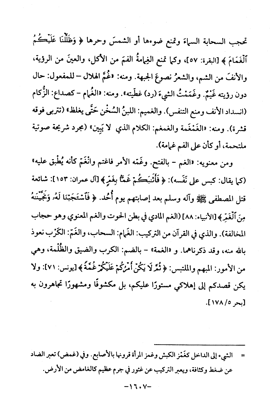 ومن معنويه: "الغم -بالفتح. وغَمّه الأمر فاغتم وانْغَمّ كأنه يُطْبق عليه " (كما يقال: كبس على نَفَسه): {فَأَثَابَكُمْ غَمًّا بِغَمٍّ} [آل عمران: 153]: شائعة قتل المصطفى -صلى اللَّه عليه وسلم- وآله وسلم بعد إصابتهم يوم أُحُد. {فَاسْتَجَبْنَا لَهُ وَنَجَّيْنَاهُ مِنَ الْغَمِّ} [الأنبياء: 88] (الغم المادي في بطن الحوت والغم المعنوي وهو حجاب المخالفة). والذي في القرآن من التركيب: الغَمام: السحاب، والغَمّ: الكرب نعوذ باللَّه منه، وقد ذكرناهما. و "الغمة "-بالضم: الكرب والضيق والظُلْمة، وهي من الأمور: المبهم والملتبس: {ثُمَّ لَا يَكُنْ أَمْرُكُمْ عَلَيْكُمْ غُمَّةً} [يونس: 71]: ولا يكن قصدكم إلى إهلاكي مستورًا عليكم، بل مكشوفًا ومشهورًا تجاهرون به [بحر 5/ 178].