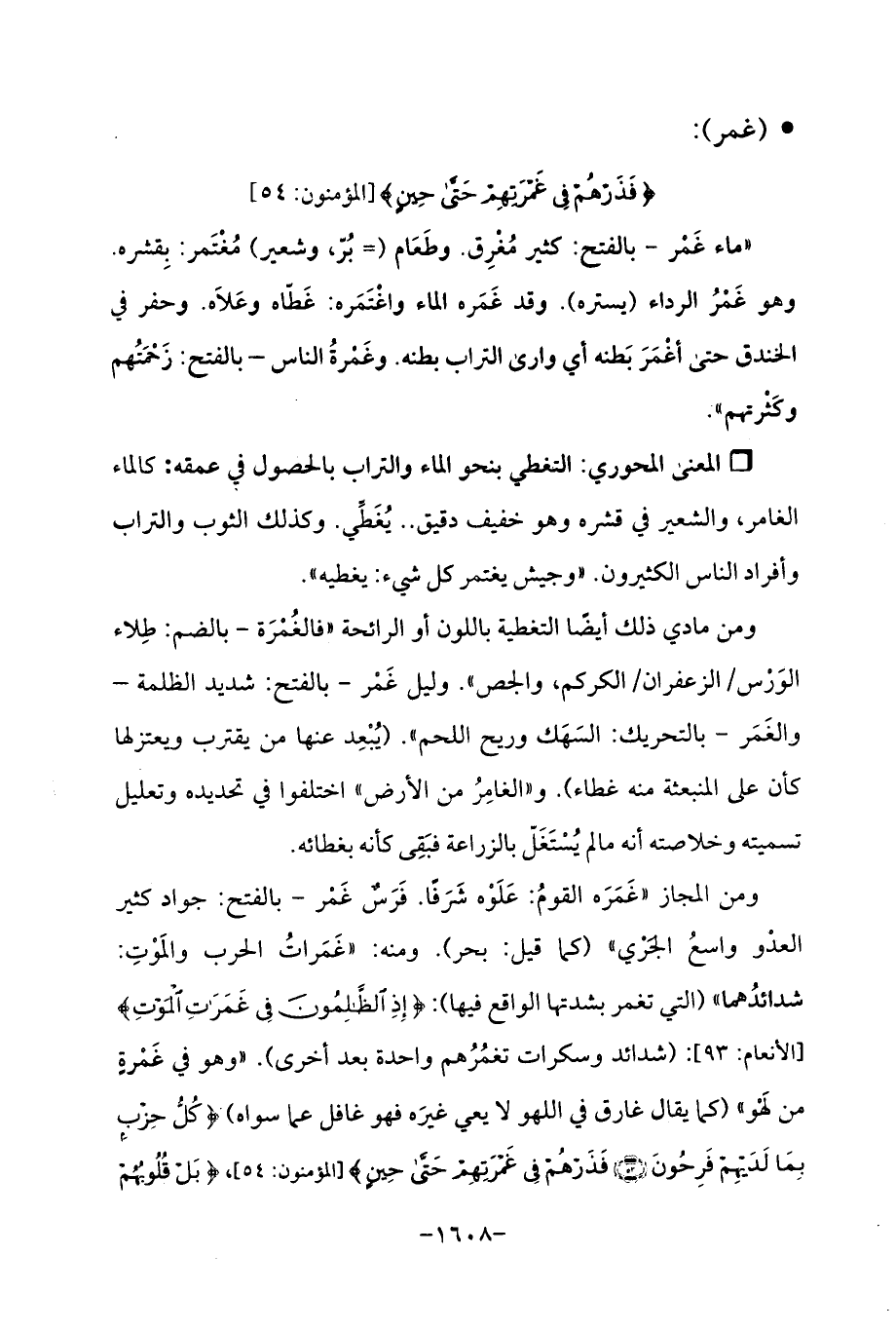 "ماء غَمْر -بالفتح: كثير مُغْرِق. وطَعَام (= بُرّ، وشعير) مُغْتَمر: بِقشره. وهو غَمْرُ الرداء (يستره). وقد غَمَره الماء واغْتَمَره: غَطّاه وعَلَاه. وحفر في الخندق حتى أغْمَرَ بَطنه أي وارى التراب بطنه. وغَمْرةُ الناس -بالفتح: زَحْمَتُهم وكَثْرتهم ".