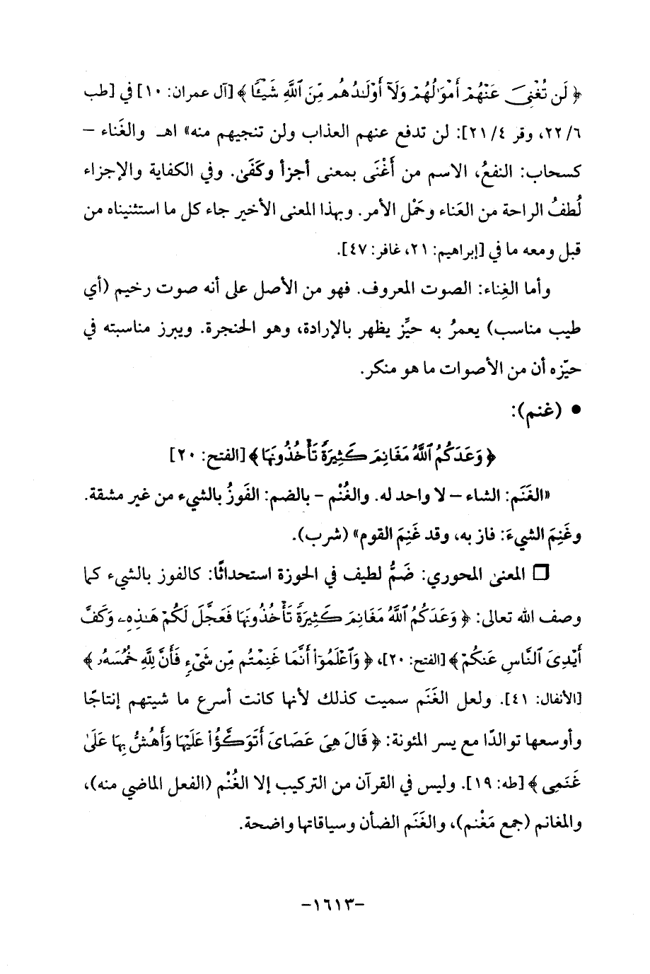 {لَنْ تُغْنِيَ عَنْهُمْ أَمْوَالُهُمْ وَلَا أَوْلَادُهُمْ مِنَ اللَّهِ شَيْئًا} [آل عمران: 10] في [طب 6/ 22، وقر 4/ 21]: لن تدفع عنهم العذاب ولن تنجيهم منه "اهـ والغَناء - كسحاب: النفعُ، الاسم من أَغْنَى بمعنى أجزأ وكَفَى. وفي الكفاية والإجزاء لُطفُ الراحة من العَناء وحَمْل الأمر. وبهذا المعنى الأخير جاء كل ما استثنيناه من قبل ومعه ما في [إبراهيم: 21، غافر: 47].