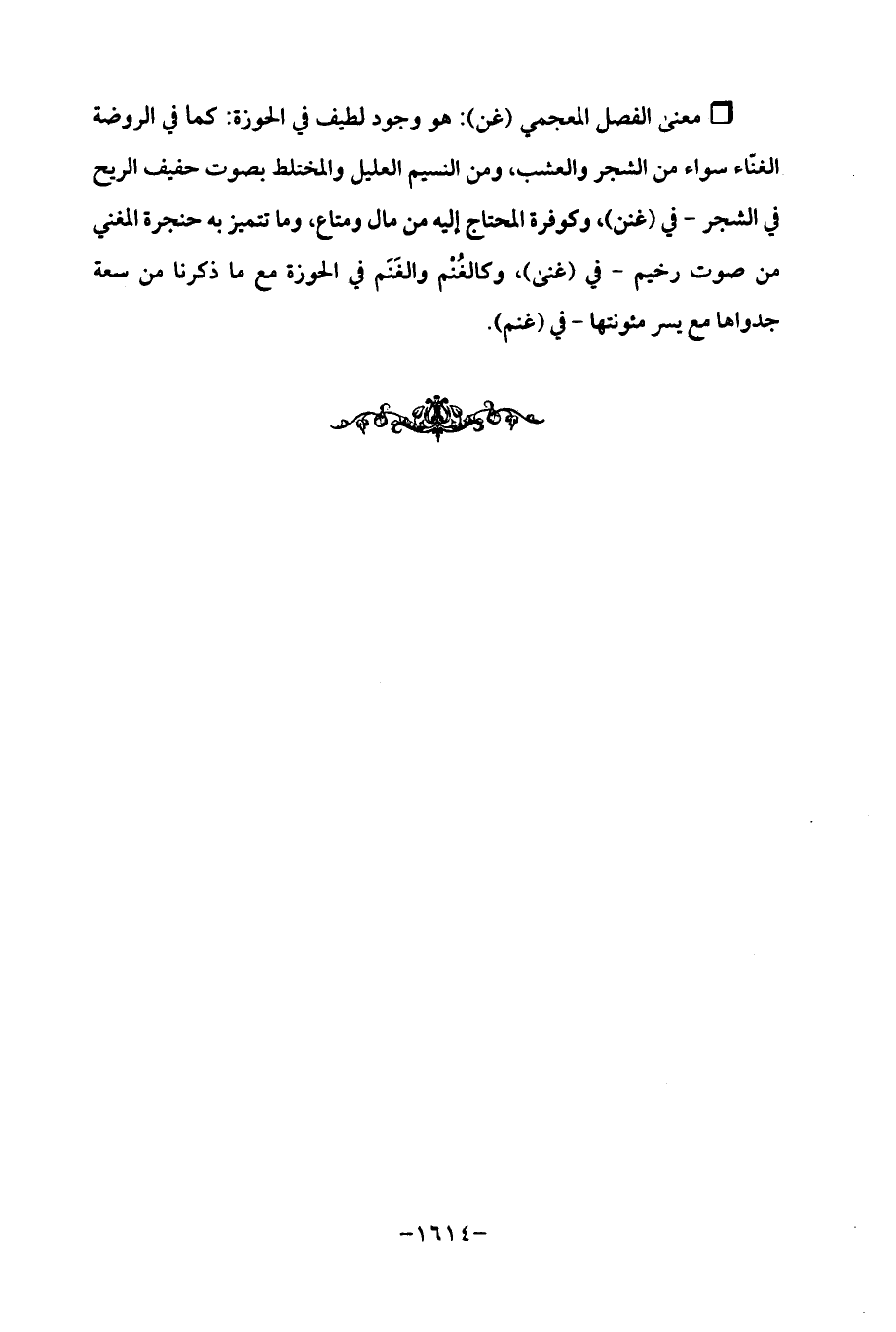 ° معنى الفصل المعجمي (غن): هو وجود لطيف في الحوزة: كما في الروضة الغنّاء سواء من الشجر والعشب، ومن النسيم العليل والمختلط بصوت حفيف الريح في الشجر -في (غنن)، وكوفرة المحتاج إليه من مال ومتاع، وما تتميز به حنجرة المغني من صوت رخيم -في (غنى)، وكالغُنْم والغَنَم في الحوزة مع ما ذكرنا من سعة جدواها مع يسر مئونتها -في (غنم).