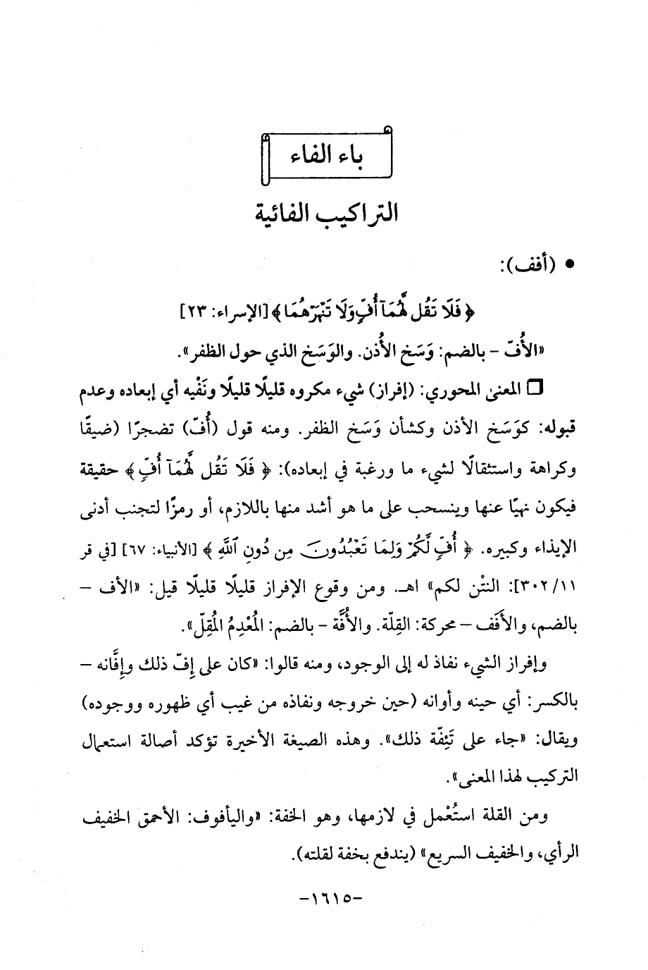 Q(إفراز) شيء مكروه قليلًا قليلًا ونَفْيه أي إبعاده وعدم قبوله: كوَسَخ الأذن وكشأن وَسَخ الظفر. ومنه قول (أُفّ) تضجرًا (ضيقًا وكراهة واستثقالًا لشيء ما ورغبة في إبعاده): {فَلَا تَقُلْ لَهُمَا أُفٍّ} حقيقة فيكون نهيًا عنها وينسحب على ما هو أشد منها باللازم، أو رمزًا لتجنب أدنى الإيذاء وكبيره. {أُفٍّ لَكُمْ وَلِمَا تَعْبُدُونَ مِنْ دُونِ اللَّهِ} [الأنبياء: 67] [في قر 11/ 302]: النتْن لكم "اهـ. ومن وقوع الإفراز قليلًا قليلًا قيل: "الأف -بالضم، والأَفَف -محركة: القِلّة. والأُفَّة -بالضم: المُعْدِمُ المُقِلّ ".