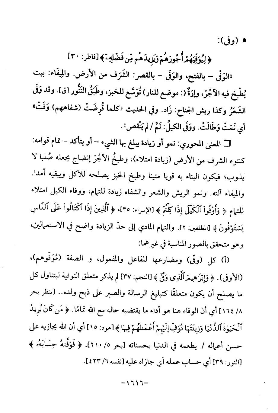 (أ) كل (وفّى) ومضارعها للفاعل والمفعول، والصفة (مُوَفّوهم)، (الأوفى). {وَإِبْرَاهِيمَ الَّذِي وَفَّى} [النجم: 37] لم يذكر متعلق التوفية ليتناول كل ما يصلح أن يكون متعلقًا كتبليغ الرسالة والصبر على ذبح ولده. . [ينظر بحر 8/ 164] أي أن الوفاء هنا هو أداء ما يقتضيه حاله مع اللَّه تمامًا. {مَنْ كَانَ يُرِيدُ الْحَيَاةَ الدُّنْيَا وَزِينَتَهَا نُوَفِّ إِلَيْهِمْ أَعْمَالَهُمْ فِيهَا} [هود: 15]، أي أن اللَّه يجازيه على حسن أعماله/ يطعمه في الدنيا بحسناته [بحر 5/ 210]. {فَوَفَّاهُ حِسَابَهُ} [النور: 39] أي حساب عمله أي جازاه عليه [نفسه 6/ 423].