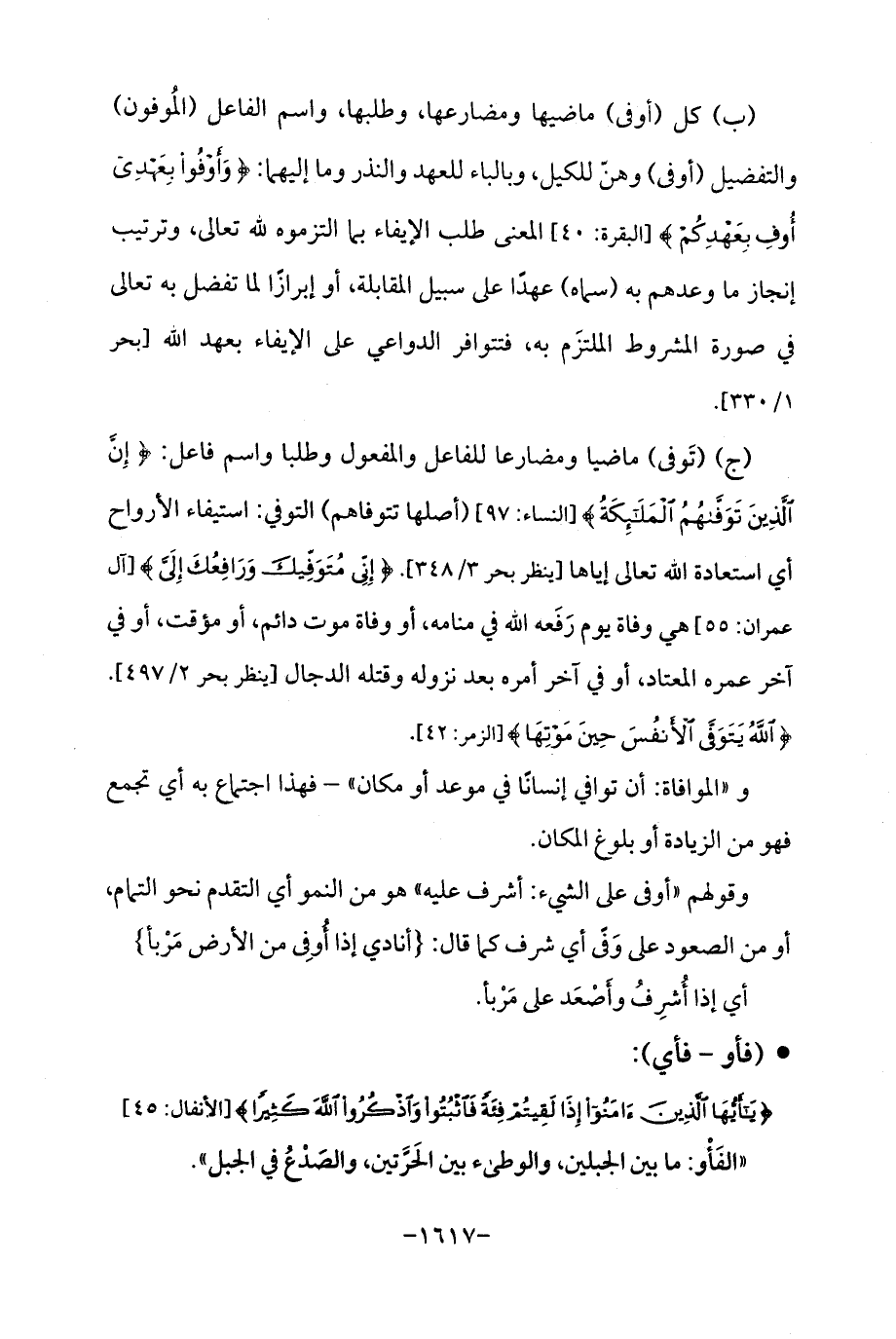 (ب) كل (أوفى) ماضيها ومضارعها، وطلبها، واسم الفاعل (المُوفون) والتفضيل (أوفى) وهنّ للكيل، وبالباء للعهد والنذر وما إليهما: {وَأَوْفُوا بِعَهْدِي أُوفِ بِعَهْدِكُمْ} [البقرة: 40] المعنى طلب الإيفاء بما التزموه للَّه تعالى، وترتيب إنجاز ما وعدهم به (سماه) عهدًا على سبيل المقابلة، أو إبرازًا لما تفضل به تعالى في صورة المشروط الملتزَم به، فتتوافر الدواعي على الإيفاء بعهد اللَّه [بحر 1/ 330].