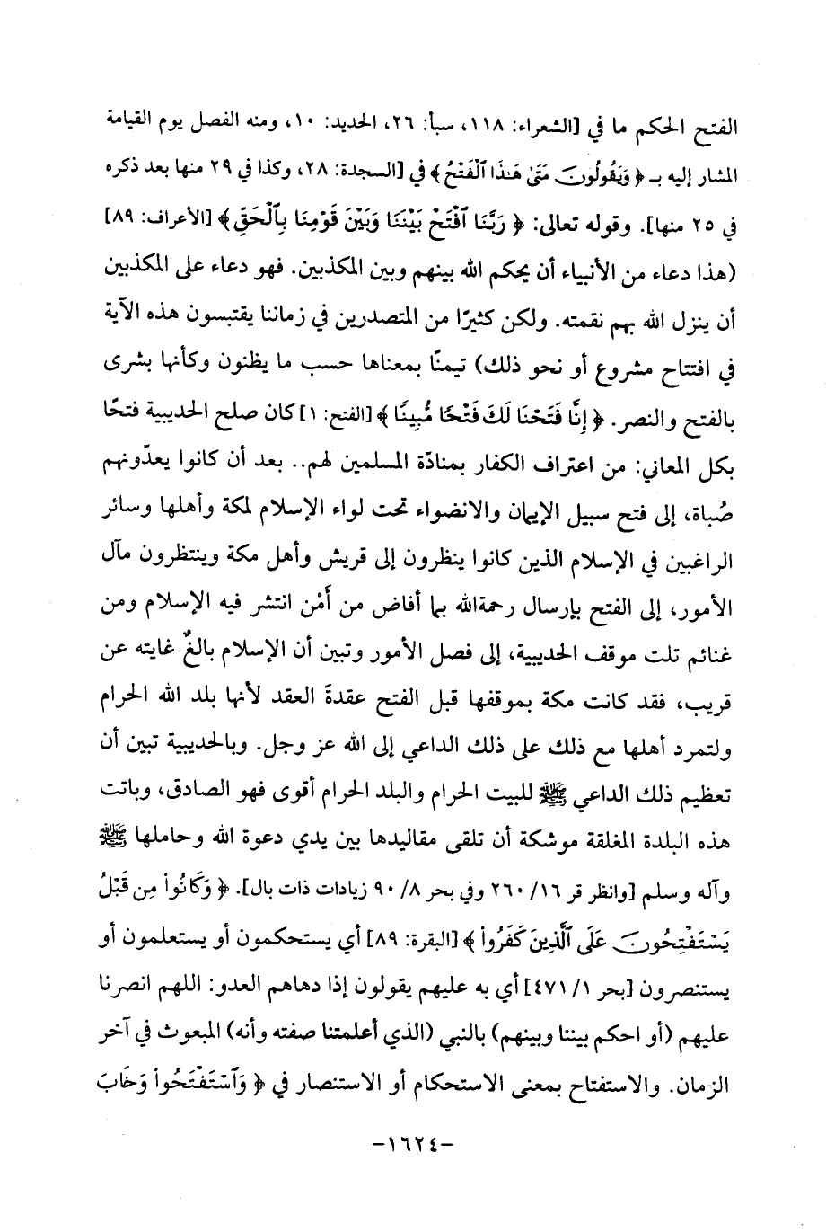 الفتح الحكم ما في [الشعراء: 118، سبأ: 26، الحديد: 10، ومنه الفصل يوم القيامة المشار إليه بـ {وَيَقُولُونَ مَتَى هَذَا الْفَتْحُ} في [السجدة: 28، وكذا في 29 منها بعد ذكره في 25 منها]. وقوله تعالى: {رَبَّنَا افْتَحْ بَيْنَنَا وَبَيْنَ قَوْمِنَا بِالْحَقِّ} [الأعراف: 89] (هذا دعاء من الأنبياء أن يحكم اللَّه بينهم وبين المكذبين. فهو دعاء على المكذبين أن ينزل اللَّه بهم نقمته. ولكن كثيرًا من المتصدرين في زماننا يقتبسون هذه الآية في افتتاح مشروع أو نحو ذلك) تيمنًا بمعناها حسب ما يظنون وكأنها بشرى بالفتح والنصر. {إِنَّا فَتَحْنَا لَكَ فَتْحًا مُبِينًا} [الفتح: 1] كان صلح الحديبية فتحًا بكل المعاني: من اعتراف الكفار بمنادّة المسلمين لهم. . بعد أن كانوا يعدّونهم صُباة، إلى فتح سبيل الإيمان والانضواء تحت لواء الإسلام لمكة وأهلها وسائر الراغبين في الإسلام الذين كانوا ينظرون إلى قول وأهل مكة وينتظرون مآل الأمور، إلى الفتح بإرسال رحمة اللَّه بما أفاض من أَمْن انتشر فيه الإسلام ومن غنائم تلت موقف الحديبية، إلى فصل الأمور وتبين أن الإسلام بالغٌ غايته عن قريب، فقد كانت مكلة بموقفها قبل الفتح عقدةَ العقد لأنها بلد اللَّه الحرام ولتمرد أهلها مع ذلك على ذلك الداعي إلى اللَّه عز وجل. وبالحديبية تبين أن تعظيم ذلك الداعي -صلى اللَّه عليه وسلم- للبيت الحرام والبلد الحرام أقوى فهو الصادق، وباتت هذه البلدة المغلقة موشكة أن تلقى مقاليدها بين يدي دعوة اللَّه وحاملها -صلى اللَّه عليه وسلم- وآله وسلم [وانظر قر 16/ 260 وفي بحر 8/ 90 زيادات ذات بال]. {وَكَانُوا مِنْ قَبْلُ يَسْتَفْتِحُونَ عَلَى الَّذِينَ كَفَرُوا} [البقرة: 89] أي يستحكمون أو يستعلمون أو يستنصرون [بحر 1/ 471] أي به عليهم يقولون إذا دهاهم العدو: اللهم انصرنا عليهم (أو احكم بيننا وبينهم) بالنبي (الذي أعلمتنا صفته وأنه) المبعوث في آخر الزمان. والاستفتاح بمعنى الاستحكام أو الاستنصار في {وَاسْتَفْتَحُوا وَخَابَ