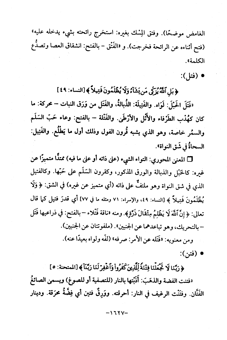 Qالتواء الشيء (على ذاته أو على ما فيه) ممتدًّا متميزًا عن غيره: كالحَبْل والذبالة والورق المذكور، وكقرون السَلَم على حَبّها. وكالفتيل الذي في شق النواة وهو ملتفٌّ على ذاته (أي متميز عن غيره) في الشق: {وَلَا يُظْلَمُونَ فَتِيلًا} [النساء: 49، والإسراء: 71 ومثله ما في 77] أي قدرَ فتيل كما قال تعالى: {إِنَّ اللَّهَ لَا يَظْلِمُ مِثْقَالَ ذَرَّةٍ}. ومنه "ناقة فَتْلاء -بالفتح: في ذراعيها فَتَل -بالتحريك، وهو تباعدهما عن الجنبين ". (ملفوتتان عن الجنبين).